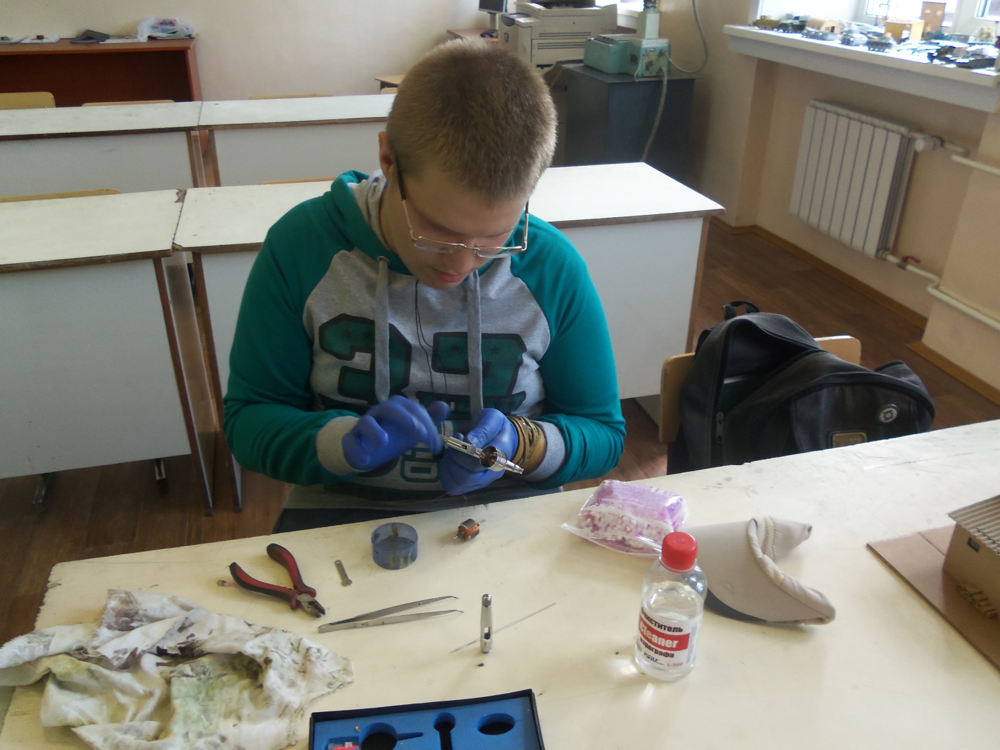 Она сама по себе занимается. Она преподаватель истории и обществознания, ей работы и без кружка хватает. Она дома иногда красит, либо делает модели.