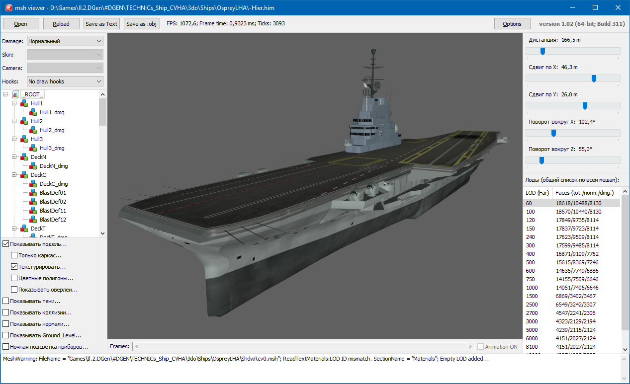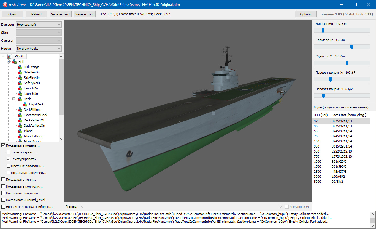 Всем доброго времени суток и спасибо за подсказки. Однако самолеты проваливаются сквозь палубу. Скачал и открыл в блендере и mesh_dump-е модель Унрю от вестерна. По видимому коллижены до уровня полетной палубы не доходят. Т.е. опоры на них нет. Попробовал покататься на Шторьхе по палубе, выяснил, что самолетик сваливается в воду, в метре-двух от видимой границы полетной палубы.