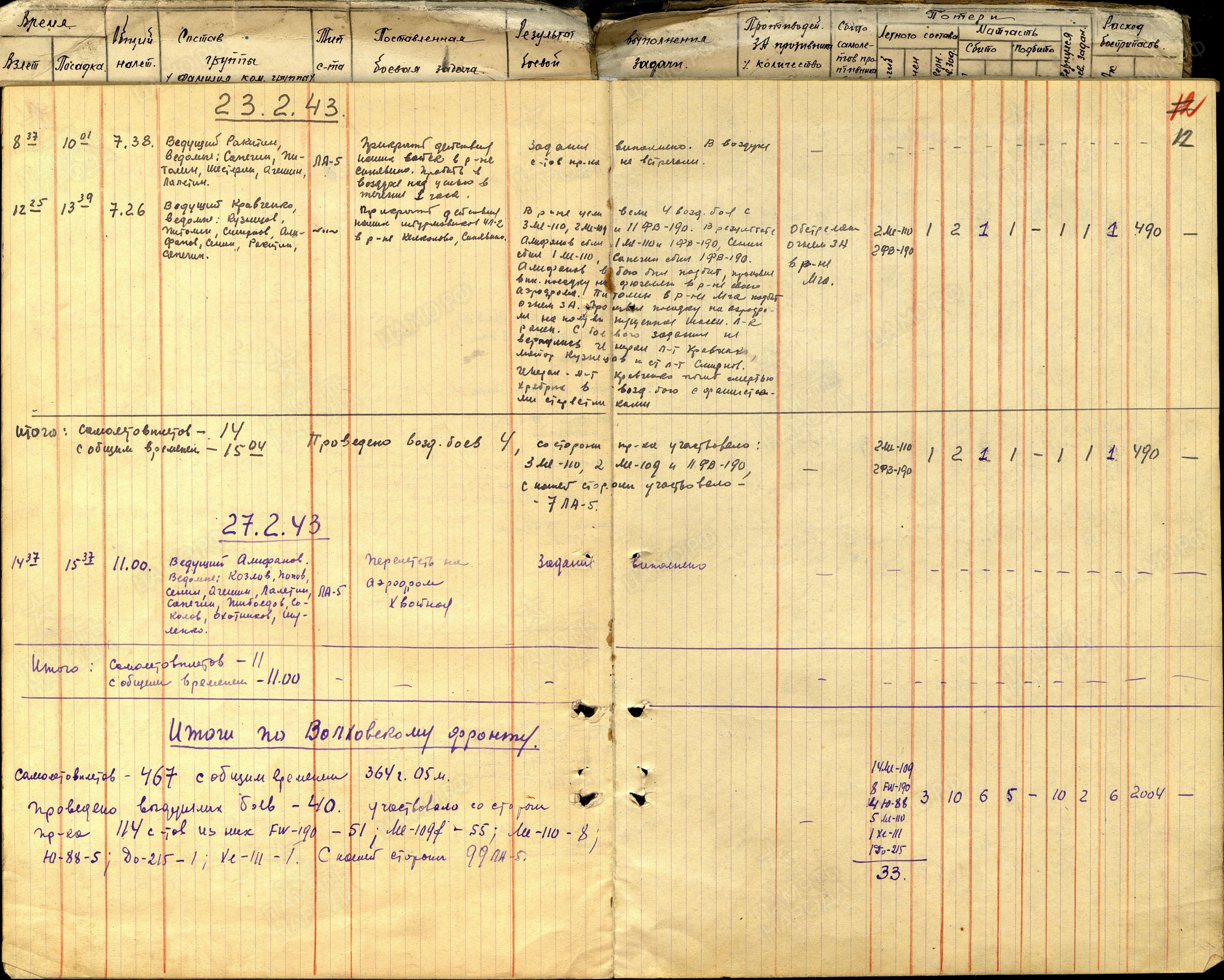 Кстати, статья сподвигла зайти на "Память народа" где изучаю сейчас ЖБД 263 полка. Есть упоминания и о деде. Нашёл вылет за 19 февраля на "прикрытие боевых действий войск 54 А". Были заявлены 1 Ю-88 и 1 Ме-109. А на скрепке как раз отчёт за 23 и 27 февраля. 11 самолётов осталось в полку к окончанию операции. Файл хоть и ужал с 14 Мб, но весит всё-равно немало-2 Мб. Цитата: