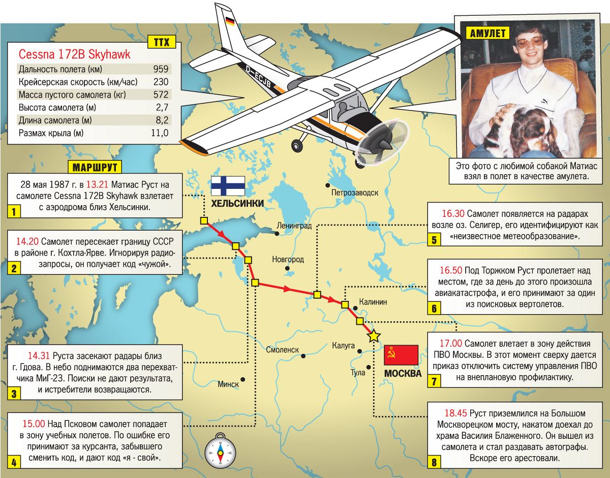 28-го мая 1987 года молодой, но уже достаточно опытный, немецкий летчик-любитель Матиас Руст (ему тогда было всего 19 лет) на легкомоторном самолете Cessna-172R, взлетев с аэродрома Хельсинки (Финляндия) в 13 час 21 мин, примерно в 14-00 час пересек советскую границу в районе города Кохла-Ярве и взял курс на Москву. В 18-55 час Руст благополучно приземлился на Москворецком мосту столицы, подрулил к храму Василия Блаженного, заглушил двигатель, вылез из кабины самолета и начал раздавать автографы прохожим. На нем был надет летный комбинезон красного цвета. Общее расстояние, которое пролетел Руст, составило немного более 1200 км, общее время полета около 5 часов 50 мин, средняя скорость полета 200-210 км/час, диапазон высот полета 800-400 м.