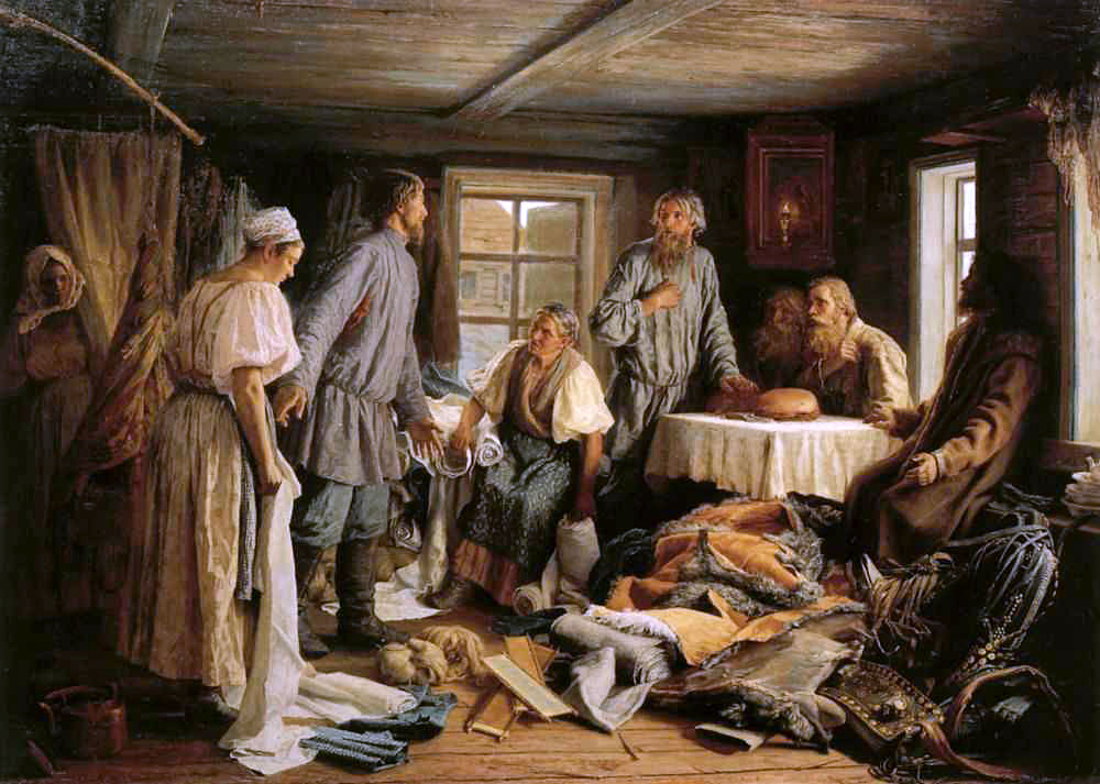 "Семейный раздел" 1876. Окинув взглядом сцену, видно что делят...И делят по-взрослому. На полу по всей комнате валяется предмет спора - барахло "папаши ихнего", который, скорее всего почил, или замёрз где нить в степи на перегоне между Саранском и Казанью. На принадлежность папаши к ямскому делу намекает хомут, что в правом углу холста. Хомут и другая упряжь, что рядом... не для запряжки пахотной лошадки, а на выезд. Шкуры, которые подле- мехами не назовешь, но ценность имеют. До них пока не дошло. Зацепились на мануфактуре. Старший брат по науськиванию своей жены заявляет, что сукно и ситец поделили, переходим на меха. Младший возникает тыча пальцем в три отреза по 5 аршин и недоволен. Я, если честно, тоже бы не стерпел, если бы меня так кидали. Мы видим кучу, которая осталась у старшего брата. Младшая сноха, что стоит по праву его руку ( у нас слева от младшего) смотрит на "богайство" и не проявляет ни возмущения, ни агрессии. Но, её муж уже успел зацепить старшего брата каким нибудь словосочетанием. Видите, старший тычит себя в грудь, чуть ли не кулаком, и оправдываясь, нападает. В правом углу, под иконой сидят два бородача. То, скорее всего братья их папаши. Приглашены в качестве арбитров. Судя по караваю, что на столе перед ними, всё начиналось пристойно...но, на каком то этапе что то пошло не так. Те и заткнулись. В самом левом краю скорее всего какая то родственница, или сирота...которая живёт у них на правах девки. В правом краю дед, которому до всего есть дело. Особенно, когда в конце этого дела наливают. Он не родственник, не близкий. Эта вся компания знает только его отчество, или прозвище. Типа "Щукарь". Но он тоже, аж рот раскрыл от слов младшего брата. НО! Я давно вам говорил, что ключик любой сцены нужно искать в центре, либо рядом с центром. Вот она-старшая сноха. Она и есть зачинщица междуусобицы. Жадина. Да, у неё всё написано Максимовым на лице. А руки не специально, а автоматом прилипают к барахлу, которое жалко отдавать. Обращаю ваше внимание, что картина была закончена в 1876 году, это через 15 лет после отмены крепостного права. Самое время, когда на Руси занялись делением и дележом, вплоть до поножовщины. И самое страшное, что это чаще происходило меж родными братьями. Последний раз редактировалось Chernomor; 18.04.2019 в 00:21. |