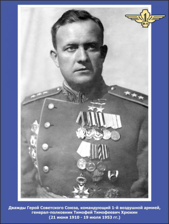 Представляю книгу генерал-майора авиации В.А. Киселева «Командарм Тимофей Хрюкин». Книга посвящена памяти замечательного советского летчика (участника боев в Испании и в Китае в конце 30-х годов) и командира (командующего), дважды Героя Советского Союза генерал-полковника авиации Хрюкина Тимофея Тимофеевича (1910 - 1953г.г.). В период войны Хрюкин Т.Т. командовал несколькими Воздушными армиями (12-ой ВА, 8-ой ВА, 1-ой ВА). После войны генерал Хрюкин Т.Т. был командующим Войсками ПВО Бакинского района, а после окончания Академии Генерального штаба - заместителем ГК ВВС по ВУЗам. Во время войны Хрюкин Т.Т., будучи командующим 8-ой и 1-ой ВА, в состав которых входил и 9-ый ГИАП, являлся фронтовым командиром Лавриненкова В.Д. Владимир Дмитриевич, в своих книгах, с большой теплотой вспоминал о генерале Хрюкине Т. Т.