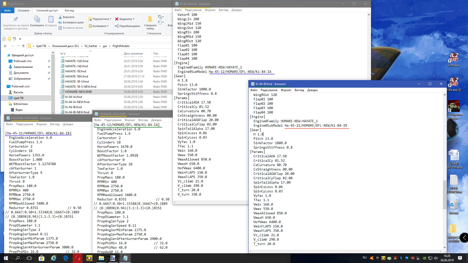 для Ки-84-1А на высоте 6100 метров снизил с 1643 л.с. до 1620 лош. сил. У земли при мощности 1825 сил Хаят достигает 560 км. в час, а на высоте 7100 метров 685 км. в час. Это такой компромис между настройкой мотора и возможностями кода игры общёта работы ВМГ на разных высотах. Возможно в новом патче 4.14 с новой атмосферой скорости на высоте будут немного меньше. Сейчас же, если потянуть сверху, то уронится и низ, если стабилизировать как по ттх, то верх в патчах 4.12.2 и 4.13.4 будет черезмерно задрат. Про БАТ промолчу - видать там беда с атмосферой. Тестил в боях с Лавками с перенастроенными моторами без пересчёта мощности. Внизу архив - работают в патчах 4.12.2 и 4.13.4. У меня работают с кокпитами из Д-Ген пака, которые давал Димас, но на форуме ссылку на эти кокпиты уже не нашёл. Последний раз редактировалось Vasya; 30.06.2019 в 03:44. |