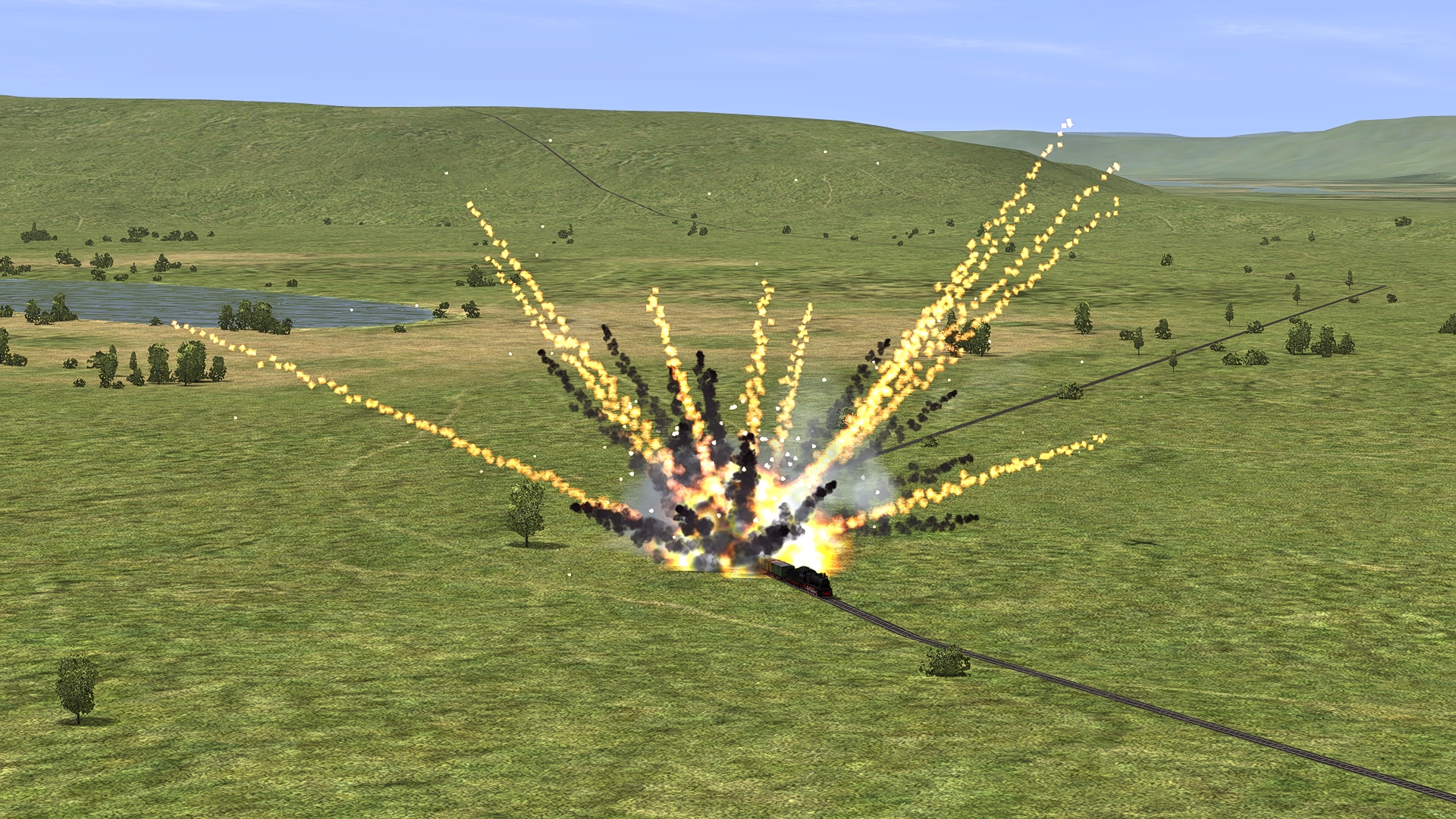 Василь, "точечки с огненным хвостиком" - был и такой подобный вариант на скрине 1, но отказался, т.к. вагоны с б/п в составе взрываются то несколько разом, то скоротечно друг за другом и получается, на мой взляд, ну не так как надо бы, а что-то похожее на новогодний "фельверк". А по "крупным точкам" - белые разлетающиеся частицы подправил, но может ты имел ввиду что-то типа металического - и это пробовал, но мне не очень, хотя на вкус... А добавить 20сек: взять из папки "Bridges" три файла с "Structure" и скопировать в папку VagonArmor, переименовать файл SmokeBoiling2.eff в Spark2.eff (будет замена белых разлетающихся частиц на болванки) и смотри на скрине 2, а если хочешь "...разлетающиеся при взрыве снаряды...", то текстуру "Structure" замени на снаряд, видел где-то, не вспомню где... может и в текстурах ила...