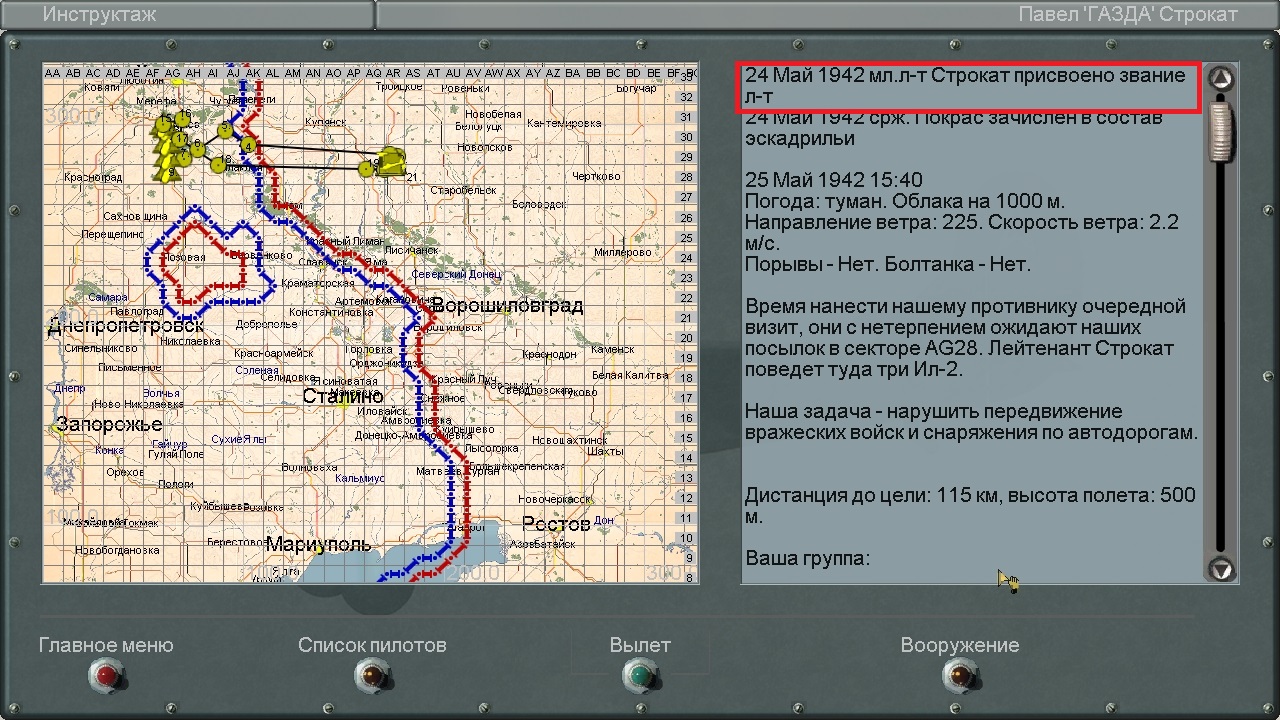 Вот забыл прошлый раз залить: - на первых двух разные звания перед одной и той же миссией - не третьем все пройденные миссии, чтоб ранее выложенные ошибки проверить. Тип самолета изменился перед вылетом на Рогань. - на 4-м-5-м бланкВПП на неподходящей по текстуре местности: кустарники.