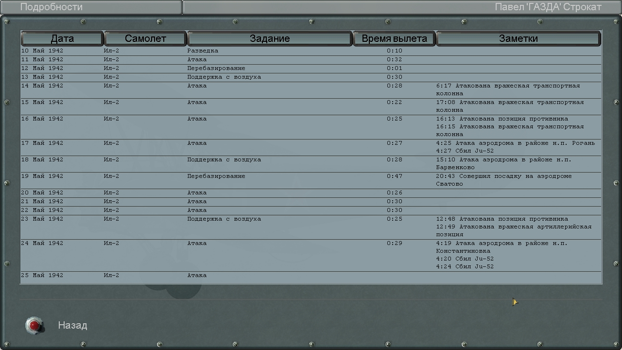 Вот забыл прошлый раз залить: - на первых двух разные звания перед одной и той же миссией - не третьем все пройденные миссии, чтоб ранее выложенные ошибки проверить. Тип самолета изменился перед вылетом на Рогань. - на 4-м-5-м бланкВПП на неподходящей по текстуре местности: кустарники.