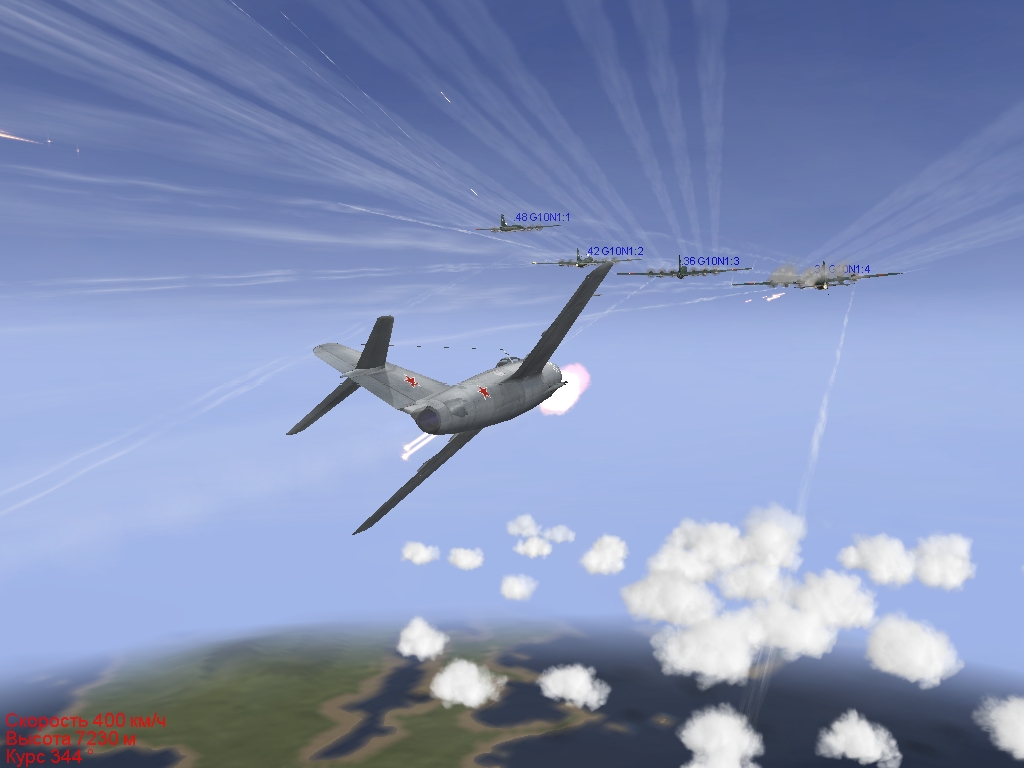 ТЕКСТ БРИФИНГА: «Август 1949 года – Вторая Мировая война продолжается, боевые действия, в основном, идут на Тихоокеанском ТВД. 225-ый ИАП, базирующийся на полевом аэродроме «Сухая речка» под Владивостоком, заканчивает перевооружение на новейший реактивный истребитель МИГ-15, а первая эскадрилья полка уже заступила на боевое дежурство. 22 августа в 9-00 ч. с КП ИАП поступила команда поднять в воздух дежурное звено МИГ-15 в полном составе – со стороны Японии в воздушное пространство СССР вошло звено (4 самолета) новейших японских стратегических бомбардировщиков G10N1 «Fugaku», которые держат курс на Владивосток, самолеты идут без воздушного прикрытия. Вы командир дежурного звена – ваша задача обнаружить и уничтожить пушечным огнем звено японских стратегических бомбардировщиков G10N1 над морем на подходе к Владивостоку. Маршрут полета указан в полетной карте, эшелон полета японских бомбардировщиков 6500 м, встреча с ними в квадрате AR-11. Метеоусловия на маршруте – ПМУ, редкая облачность с нижним краем 3000м. Будьте очень внимательны, самолеты G10N1 имеют мощное оборонительное артиллерийское вооружение с круговым обстрелом, а сами самолеты идут плотным строем. Поэтому, при сближении с ними, активно маневрируйте, применяйте бортовое вооружение на максимальной разрешенной дальности. После выполнения боевой задачи произвести посадку на аэродром «Сухая речка» и зарулить на свою стоянку». Скриншоты миссии я представляю. Рекомендую первый раз пройти миссию на автопилоте. |