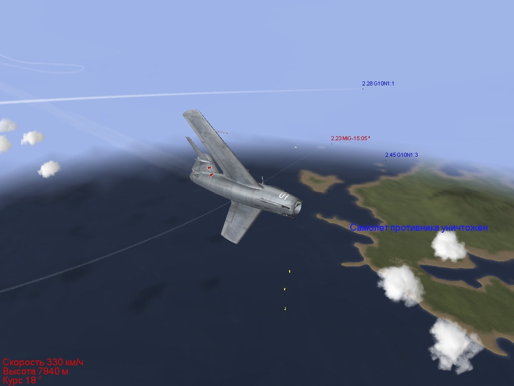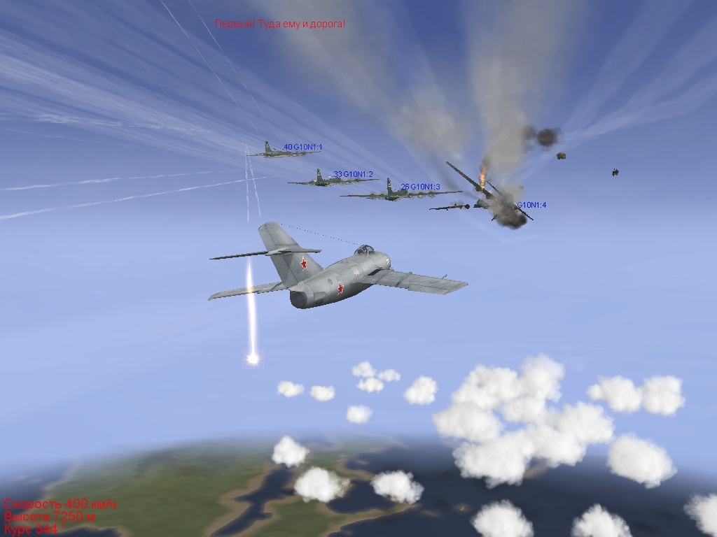 ТЕКСТ БРИФИНГА: «Август 1949 года – Вторая Мировая война продолжается, боевые действия, в основном, идут на Тихоокеанском ТВД. 225-ый ИАП, базирующийся на полевом аэродроме «Сухая речка» под Владивостоком, заканчивает перевооружение на новейший реактивный истребитель МИГ-15, а первая эскадрилья полка уже заступила на боевое дежурство. 22 августа в 9-00 ч. с КП ИАП поступила команда поднять в воздух дежурное звено МИГ-15 в полном составе – со стороны Японии в воздушное пространство СССР вошло звено (4 самолета) новейших японских стратегических бомбардировщиков G10N1 «Fugaku», которые держат курс на Владивосток, самолеты идут без воздушного прикрытия. Вы командир дежурного звена – ваша задача обнаружить и уничтожить пушечным огнем звено японских стратегических бомбардировщиков G10N1 над морем на подходе к Владивостоку. Маршрут полета указан в полетной карте, эшелон полета японских бомбардировщиков 6500 м, встреча с ними в квадрате AR-11. Метеоусловия на маршруте – ПМУ, редкая облачность с нижним краем 3000м. Будьте очень внимательны, самолеты G10N1 имеют мощное оборонительное артиллерийское вооружение с круговым обстрелом, а сами самолеты идут плотным строем. Поэтому, при сближении с ними, активно маневрируйте, применяйте бортовое вооружение на максимальной разрешенной дальности. После выполнения боевой задачи произвести посадку на аэродром «Сухая речка» и зарулить на свою стоянку». Скриншоты миссии я представляю. Рекомендую первый раз пройти миссию на автопилоте. |
