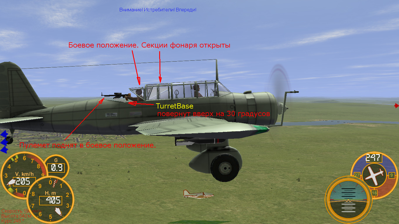 Все строки контроля турели удалил. И в классе самолета, и в классе кокпита стрелка, и в разных вариантах, но толку нет никакого. Впрочем есть, иногда, но крайне редко, пулемет дает пару-тройку выстрелов и замолкает. Есть мысли, что виноват кокпит стрелка Энн. Уж очень велико расстояние между центральными точками опоры пулемета внешней модели и пулемета кокпита. Полагаю, что наводка обеих стволов как то взаимосвязанна. А навести оба ствола в одну точку невозможно. Единственный небольшой сектор сведения есть строго по средней линии, но именно там с классах наложено ограничение по стрельбе и где то в ту сторону пулемет иногда постреливает.