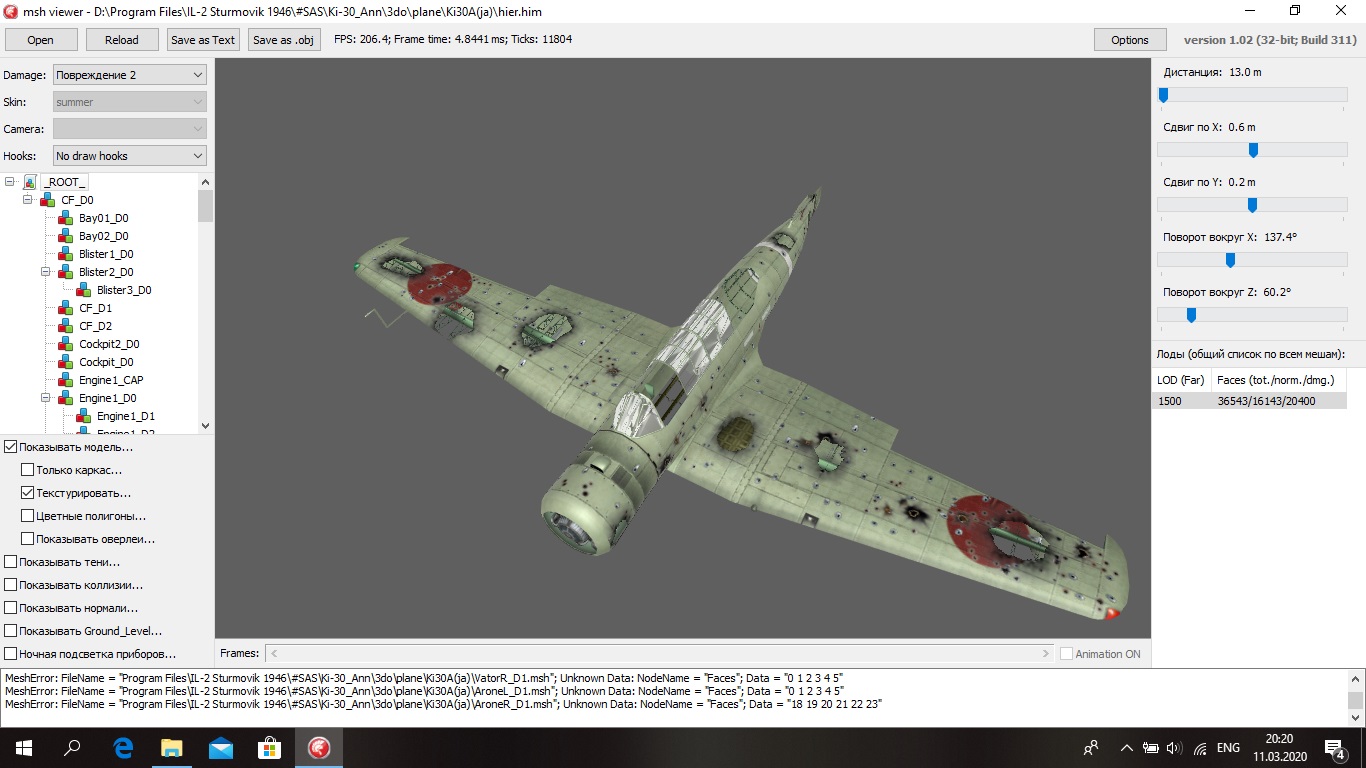 В результате: у Д3А2 все таки можно повредить крылья, нужна высокая плотность огня. Крылья повреждаются у Ил-2, Р-10, Ар-196Т. У Ил-2 уж очень мудреная модель повреждений, я её не использовал. На Р-10 весь ХитБон занимает 15 строк, то же не использовал. А вот на повреждениях от Ар-ки получил интересный эффект в виде отстреливаемых колес. Интересно смотрится. И не на одной модели повреждения не получил повреждений крыльев. Появились мысли об ошибке в модели, что то с наименованиями. Сейчас перетряхиваю модель на предмет соответствия названий коллизий частей самолета.