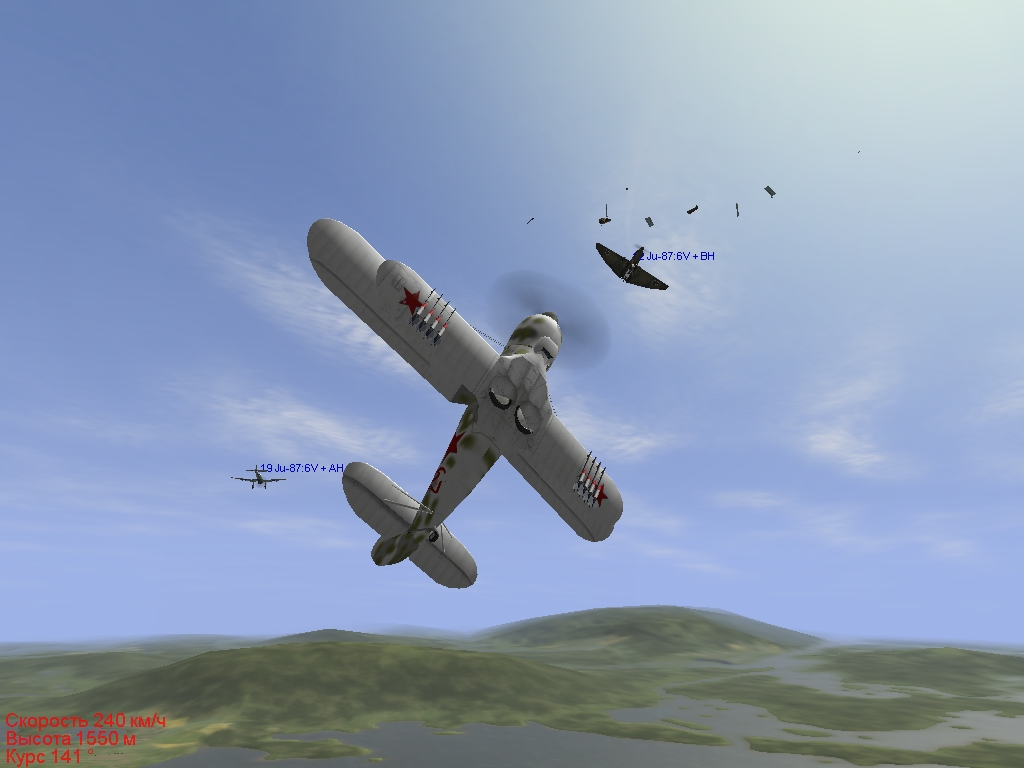 Миссия 17. Текст брифинга: 1 мая 62510 г. до Н.Э. 10час 00мин. Аэродром «ПОБЕДА-3». Несмотря на наступившие первомайские праздники, интенсивная учебно-боевая подготовка на УТК «ПОБЕДА» продолжалась – времени до начала ВОВ в СССР-41 оставалось совсем немного. Накануне генерал Захаров самостоятельно вылетел на новом пушечном истребителе-биплане И-190. Этот высокоманевренный боевой самолет был многоцелевым и в воздушной армии Захарова он будет, в ограниченном количестве, использоваться и как истребитель и как легкий штурмовик. В прошлой истории в первые месяцы войны советские войска подверглись массированным и очень эффективным бомбовым ударам немецких пикирующих бомбардировщиков Ju-87. Самолет этот, хоть и был тихоходным, но имел мощное бомбовое и стрелковое вооружение, был достаточно маневренным, а его пикирующие возможности обеспечивали высокую точность бомбометания (он был как бы прообразом современного высокоточного оружия). В состав экипажа этого самолета входил и воздушный стрелок, обеспечивающий оборону задней полусферы самолета. Очень досаждали нашим войскам и тихоходные, но высокоманевренные тактические немецкие самолеты-разведчики FW-189, прозванные нашими солдатами «Рамой». Сбить Раму, что зенитной артиллерией, что истребителями, было далеко не просто - этот самолет так же имел воздушного стрелка, защищавшего ЗПС, да и в состав его экипажа, как правило, входили очень опытные летчики. Наши солдаты часто говорили «увидел раму – жди бомбардировщиков». Вот против таких тихоходных, но маневренных воздушных целей, а так же слабо бронированных наземных и надводных целей и был предназначен многоцелевой истребитель И-190. На сегодняшний день генералу Захарову был запланирован не совсем обычный учебно-боевой полет на многоцелевом истребителе И-190. Задача: 1. Выполнить взлет и набор высоты 1300 м. Выйти в квадрат С/2, обнаружить и уничтожить пушечным огнем две воздушные мишени – немецкие пикирующие бомбардировщики Ju-87D7. Они парой выполняют полет по заданному маршруту. 2. После поражения пары Ju-87 набрать высоту 2000 м и выйти в квадрат D/5. Обнаружить и уничтожить пушечным огнем одиночную воздушную мишень – немецкий тактический разведчик FW-189. Все воздушные мишени не имеют бортового вооружения и управляются экипажем самолета ТУ-126 – его эшелон полета 1500 - 5000 м. 3. После поражения FW-189 выйти на наземный полигон УТК «ПОБЕДА», расположенный в квадрате В/4. Снизиться до высоты 500 метров, сделать несколько кругов над полигоном, выбрать наземную цель и поразить ее неуправляемыми ракетами и пушечным огнем. Посадку произвести на аэродром «ПОБЕДА-3» и зарулить на его южную стоянку. Весь маршрут полета указан в полетной карте, погода на маршруте – ПМУ. Будьте внимательны – в районе аэродрома «ПОБЕДА-3» идут интенсивные плановые полеты. Вариант вооружения вашего самолета: 8хRs82. Скин вашего самолета: стандарт. ОЗ должны быть выключены. |