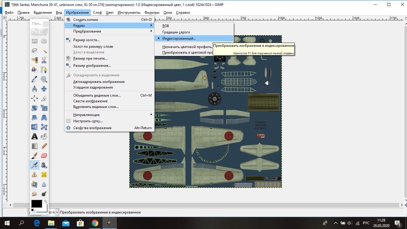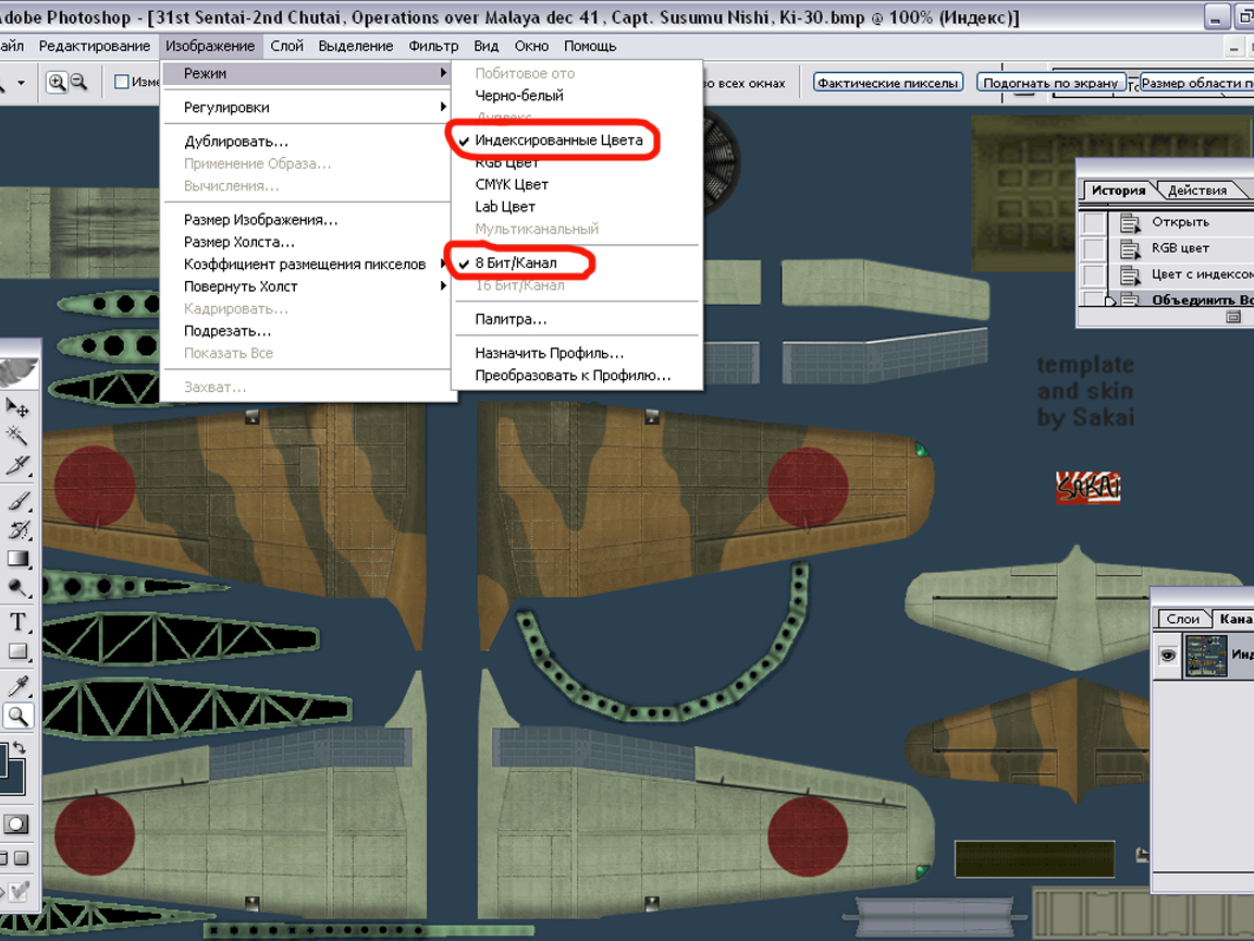 http://forum.aviaskins.com/showthread.php?t=2141 с 7 поста почитай. Sanger расписал: С начало так "Изображение=>режим=>индексированные цвета",Здесь выставляй так, чтобы визуально был лучший эффект (256 цветов). Потом "сохранить как", тип файла "бмп", формат файла Виндовс, глубина 8 бит. Файл получается размеров 1мб, игра всё видит. а потом сохраняй уже в bmp. Только не качай новых/старых браузеров для ФШ и других примочек Вот беру древний фотошоп и сохраняю твой скин в картинках, причем любым удобным способом обрати внимание на последнюю картинку. Это результат Индексированный файл---8 бит---bmp Последний раз редактировалось Mixx; 26.03.2020 в 02:37. |