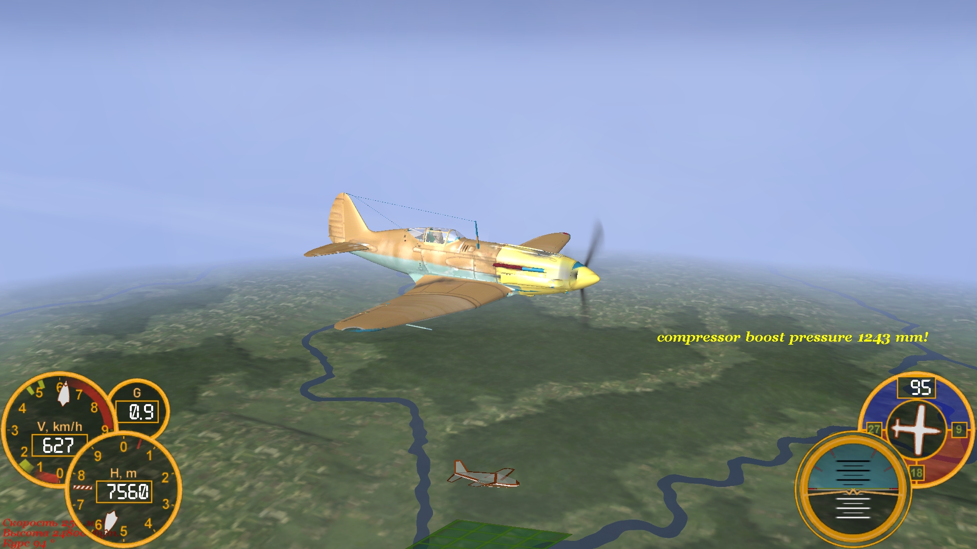 С поправленной отдачей на высоте 3350 метров Лось развивает 414 км. в час на 95 проц. тяги без перегрева и 422 на 100 проц. тяги с перегревом через минут 5-6. Думаю, получилось в меру исторично. У земли скорость в районе 380-385 км. в час. на оборотах 2600. Цитата: