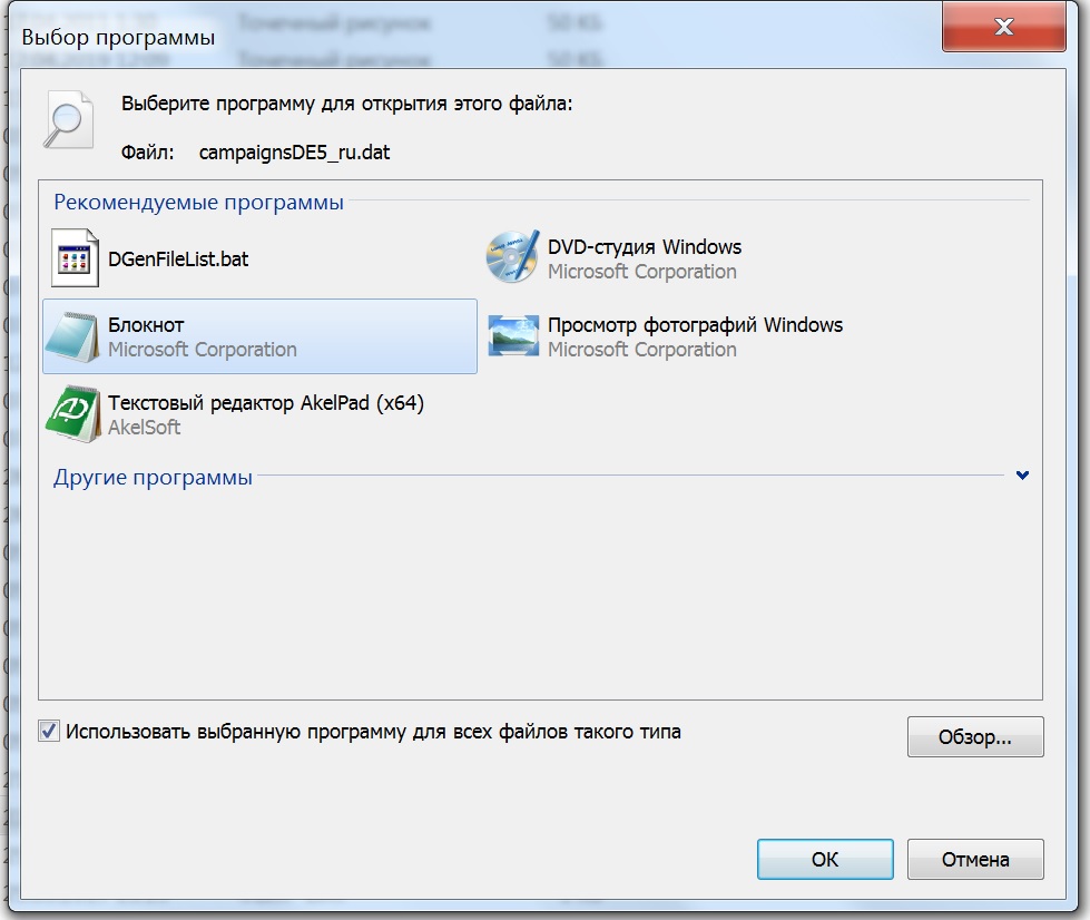 1. Нажимаем првую кн.мыши на campaignsDE7_ru.dat 2. Выбираем Открыть с помощью/Выбрать программу (рис.1) 3. Нажимаем Обзор... внизу справа 4. Выбираем DGenCustomList.bat (рис.2) Если DGenCustomList.bat и DGenCustomList.js находятся в каталоге D:\IL2_4.14.1_DGenPACK3\dgen, то все должно работать. Я так и делаю, по пунктам. Но DGenCustomList.bat в окошке выбора программы не появляется. Его там нет. Есть только DGenFileList.bat То есть, с помощью DGenFileList.bat можно открыть файл campaigns, (какой угодно), а с помощью DGenCustomList.bat почему-то нет. |