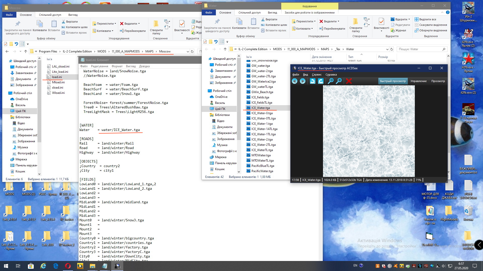 По идее, забрасываешь "пришпиленные" текстуры льда в папку water по пути _Tex\water а в load.ini в секции [WATER] замени [WATER] Water = East/stalingrad_winter/WaterIce.tga на [WATER] Water = water/ICE_fields.tga И будет тебе счастье. Но текстуру надо подгонять под Сайберловавские по цвету, яркости/контрасту P/S/ Обновил файл, там еще BumpH к нему был. К сожалению сам глянуть пока в Иле не могу. Еще, как вариант умножь текстуру поставь: Water = water/ICE_fields.tga,2 и подстрахуемся, в самом низу в load.ini карты: Water0 = water/water.tga Water1 = water/water.tga заменим на : Water0 = water/ICE_fields.tga Water1 = water/ICE_fields.tga Последний раз редактировалось Mixx; 26.05.2020 в 01:03. |