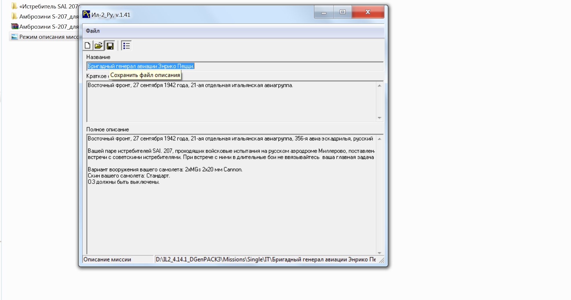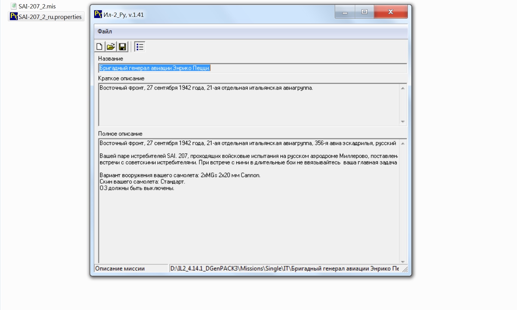 Миссия посвящена воинскому подвигу, совершенному нашим противником – итальянским бригадным генералом авиации Энрико Пецци (1897 – 1942 г.г.). С 25 февраля 1942 года и до своей гибели 29 декабря 1942 года Энрико Пецци был Командующим авиацией 8-ой Итальянской армии в России (ARMIR). В декабре 1942 года советские войска в составе Юго-Западного и Воронежского фронтов начали операцию по окружению войск 8-ой итальянской армии. Так, под городом Чертково, была окружена 14-ти тысячная группировка итало-немецких войск (группировкой командовал немецкий полковник Голлер). Для обеспечения обороны группировки итальянские военно-транспортные самолеты SM.81 и итальянские бомбардировщики BR-20M снабжали ее боеприпасами, продовольствием, медикаментами, ГСМ и вывозили в тыл раненых солдат и офицеров. В конце декабря 1942 г советские войска вплотную подошли к г.Чертково и артиллерией начали обстреливать военный аэродром города. После этого посадку на аэродром начали производить только легкие немецкие самолеты «Шторьх», а тяжелые итальянские транспортные самолеты SM.81 и бомбардировщики BR-20M сбрасывали свои грузы с воздуха. 29 декабря 1942 г лично Командующий итальянской авиацией в России бригадный генерал авиации Энрико Пецци и его экипаж, пилотируя санитарный самолет SM.81 (регистрационный номер 20257) посадил его на аэродром Чертково, выгрузил военные грузы, загрузил 20 человек тяжело раненых итальянских солдат и офицеров и под артиллерийским огнем, без истребительного сопровождения, вылетел в направлении на аэродром Ворошиловград (ныне Луганск). Но в Ворошиловград этот самолет не прибыл. Уже после войны, предположительно было установлено, что тяжелый итальянский транспортный самолет упал в 4-х км к северо-востоку от села Югановка (примерно в 42 км от г.Миллерово) – все, находящиеся на борту самолета, погибли. На борту самолета находился и начальник итальянского военного госпиталя в Ворошиловграде полковник Федерико Боккети – у него была трудная задача – отобрать из многих десятков раненых всего 20 человек (все понимали, что этот санитарный рейс последний и все остальные раненые, в лучшем случае, окажутся в советском плену). Бригадный генерал авиации Энрико Пецци в Италии посмертно был награжден Золотой медалью за воинскую доблесть. Моя миссию относится к жанру альтернативной истории со смещенными временными рамками и местом действия. Она является продолжением предыдущей миссии «Истребитель SAI. 207», ее сюжет такой – в конце сентября 1942 года вашей паре истребителей SAI. 207, проходящих войсковые испытания на русском аэродроме Миллерово поставлена задача встретить в воздухе и сопроводить до аэродрома Ворошиловград санитарный военно-транспортный самолет SM.81 – этот самолет пилотирует экипаж Командующего авиацией 8-ой Итальянской армии бригадного генерала авиации Энрико Пецци. Текст брифинга миссии «Бригадный генерал авиации Энрико Пецци»: Восточный фронт, 27 сентября 1942 года, 21-ая отдельная итальянская авиагруппа, 356-я авиа эскадрилья, русский аэродром Миллерово, время 14-40 час, метеоусловия простые. Вашей паре истребителей SAI. 207, проходящих войсковые испытания на русском аэродроме Миллерово, поставлена задача встретить в воздухе и сопроводить до аэродрома Ворошиловград санитарный военно-транспортный самолет SM.81 – этот самолет пилотирует экипаж Командующего авиаци