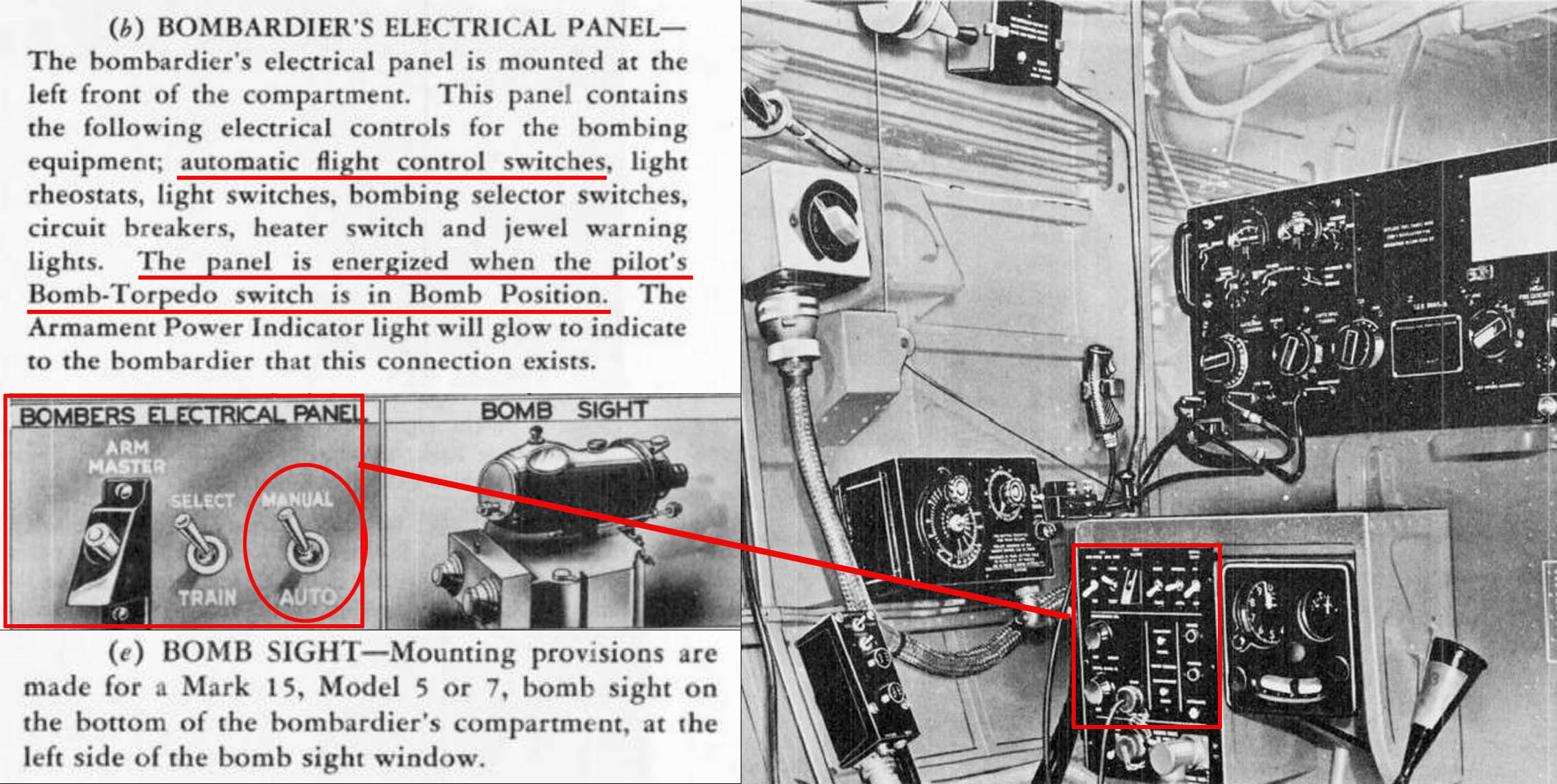 Оооооо, знакомая панелька автопилота А-5)) Позволю себе возразить, так как прицел Sperry T-1 являлся ИМЕННО бомбардировочным и устанавливался преимущественно на бомбардировщиках B-24 совместно с автопилотом А-5. Торпедные атаки на Эвенджере проводились с использованием прицела Mark 30, установленного в кабине пилота над приборной панелью, так как торпедную атаку (а также бомбометание с малых высот) проводил именно пилот со своего рабочего места. Бомбометание с больших высот проводил бомбардир с использованием прицела Norden M (он же Mark XV), который являлся штатным прицелом на Эвенджере (см. прилагаемую картинку из РЛЭ, в отделении бомбардира прицел - под приборной панелью на полу). Что касается автоматизации управления полетом, то полноценный автопилот использовался на моделях TBM-3 и ей аналогичной (позволял выполнять различные эволюции, включая продолжительных разворот, а также спирали с набором и снижением с углом по крену и тангажу до 60 градусов). На более ранних моделях (TBF, TBM и тд) применялась так называемая система стабилизации на боевом курсе (SBAE - Stabilized Bombing Approach Equipment, своего рода стабилизатор горизонтального полета/курса), органы управления которой находились слева от пилота (на TBM-3 - на приборной панели), при этом каждый канал управления настраивался отдельно, управление рулем высоты - на определенной скорости (170 узлов) и при центрированном приборе PDI. При крене более 40 градусов гироскоп отключался. В общем - куда больше геморроя, чем с автопилотом. Но процедура прицеливания оставалась той же и осуществлялась бомбардиром при включенной системе SBAE.