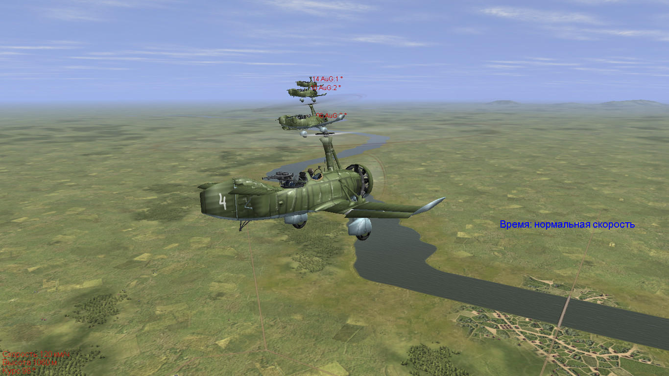 Даже короткой палубы "Комсомольца" хватает А7 для взлета. На суше для этого потребуется триста метров (для АИ). После чего автожир по крутой глиссаде взвымает вверх. На взлете и на высоте руль направления слегка повернут влево, соответственно автожир на взлете сносит в лево. На низкой высоте сильно вывернут вправо. Парирование момента несущего винта? На низкой высоте есть незначительный крен в лево. Кроме способности взлетать, автожир обрел способность выполнять "петлю Нестерова", что есть чистый эльфизм. Постоянно греется мотор. Все это пока что, на АУГ-овской ФМ-ке.