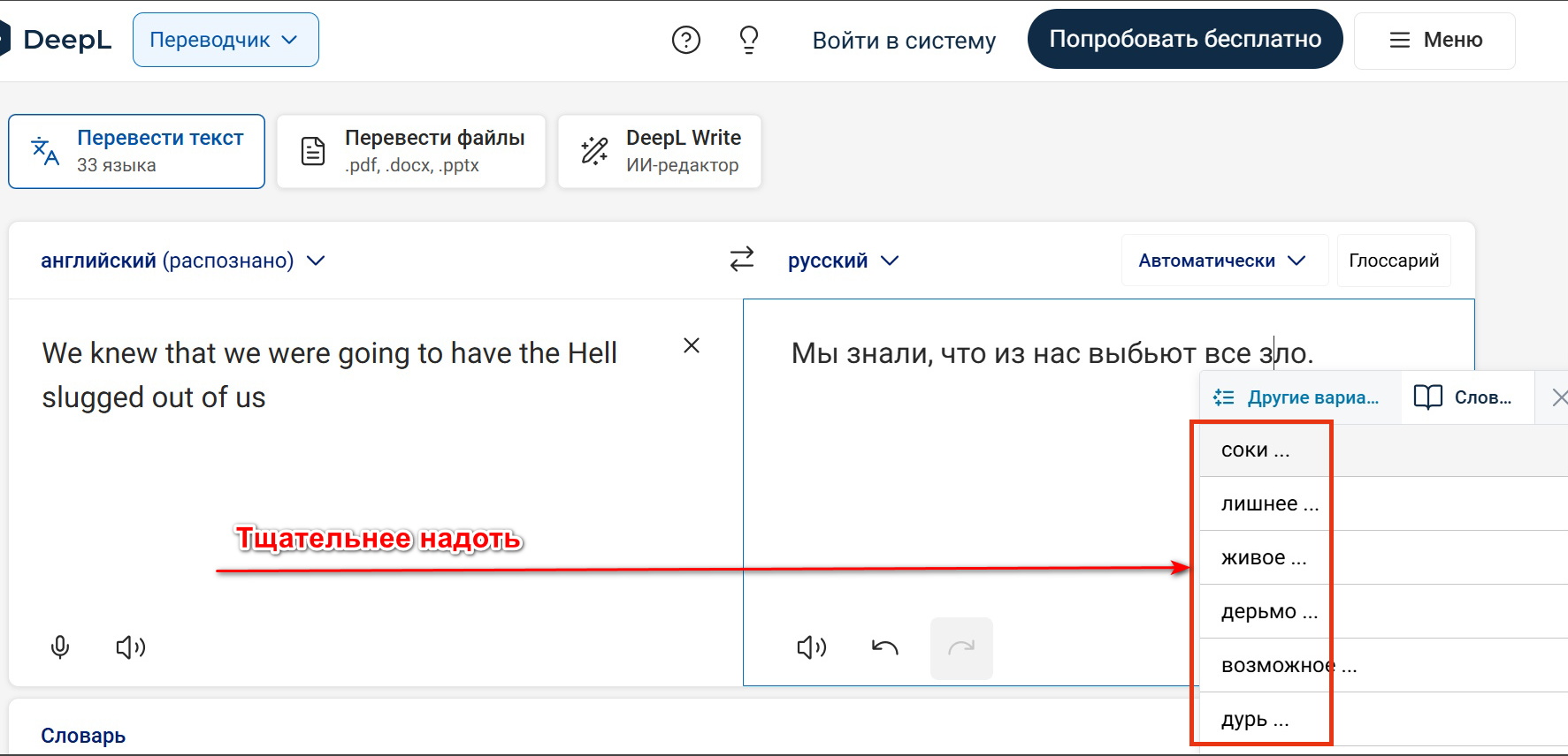 На спорном слове курсор поставь, щелкни ЛКМ - и будут другие версии перевода.
