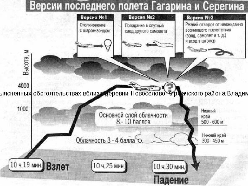 Как я уже писал выше, в настоящее время, кроме официальной, существуют порядка 30-ти неофициальных версий гибели экипажа самолета УТИ МИГ-15 в составе инструктора полковника Серегина С.В. (находился в задней кабине самолета) и проверяемого полковника Гагарина Ю.А. (находился в передней кабине самолета). Большинство этих версий в виде отдельных статей и их сборников я представляю ниже – почитайте, очень интересно и познавательно! В процессе работы Госкомиссии, расследовавшей причины авиакатастрофы УТИ МИГ-15, были выявлены факты, свидетельствующие, к сожалению, о ряде грубых нарушений правил полетов. Приведу лишь некоторые из них. 27 марта 1968 года экипаж самолета УТИ МИГ-15, бортовой номер 18, заводской номер 612739 должен был вылететь с подмосковного аэродрома Чкаловский в пилотажную зону № 20 для выполнения упражнения № 2 Курса боевой подготовки истребительной авиации (КБП ИА - 67). Для Гагарина это был контрольный полет, после успешного завершения которого, он должен был получить допуск на выполнение самостоятельного полета на истребителе МИГ-17 по упражнению № 4 КБП ИА-67 (полет по кругу в зоне аэродрома). Упражнение № 2 КБП ИА-67 – это полет в зону на простой пилотаж. Этот полет должен выполняться в простых метеоусловиях и без подвесных топливных баков. В реальной истории все произошло с точностью до наоборот – экипаж УТИ МИГ-15 произвел взлет, не дождавшись посадки разведчика погоды и не заслушав информацию о состоянии погоды на маршрутах и в пилотажных зонах, а погода в зоне № 20 была не ПМУ, а СМУ (многослойная облачность с нижним краем от 900 до 400 м). По до конца не выясненным причинам (хотя в ряде неофициальных версий катастрофы даются объяснения) экипаж вылетел на выполнение упражнения № 2 (простой пилотаж) с подвесными топливными баками, что являлось грубым нарушением требований КБП ИА-67. Был и ряд других нарушений в организации полетов на аэродроме Чкаловский в тот роковой день – они подробно описаны в прилагаемых статьях. Теперь о самой миссии – она сделана в ДГЕН ПАКе 2.1 на карте «БИТВА ЗА МОСКВУ - весна». В реальной истории пилотажная зона № 20 аэродрома Чкаловский находилась на северо-востоке от аэродрома на удалении от него примерно 30 км, а самолет УТИ МИГ-15 столкнулся с землей около деревни Новоселово, расположенной юго-восточнее г. Киржач Владимирской области (примерно в 67 км на северо-восток от аэродрома Чкаловский). Ввиду того, что на карте «БИТВА ЗА МОСКВУ» отсутствует район г. Киржач, я изменил расположение пилотажной зоны № 20 и перенес ее на север от аэродрома Чкаловский в район г. Красноармейска (он есть на карте). Далее, были введены следующие допущения: 1. Не будем нарушать требования КБП ИА-67 – вылет произведем без ПТБ, а метеоусловия в зоне аэродрома Чкаловский и в районах его пилотажных зон примем как простые (с редкой кучевой облачностью с нижним краем 900 м). 2. В реальной истории пилотаж в 20-ой зоне экипаж выполнял на высоте 4000-4200 м, а мы будем пилотировать на высотах 1100-1300 м. Это допущение введено для того, что бы в случае отказа АТ летчики не имели возможности катапультироваться (на УТИ МИГ-15 минимальная высота катапультирования из обеих кабин – 1500 м) – в реальной истории ни Гагарин Ю.А., ни Серегин С.В. в возникшей аварийной ситуации так и не катапультировались, поэтому такое допущение корректно. 3. В реальной истории Госкоми
