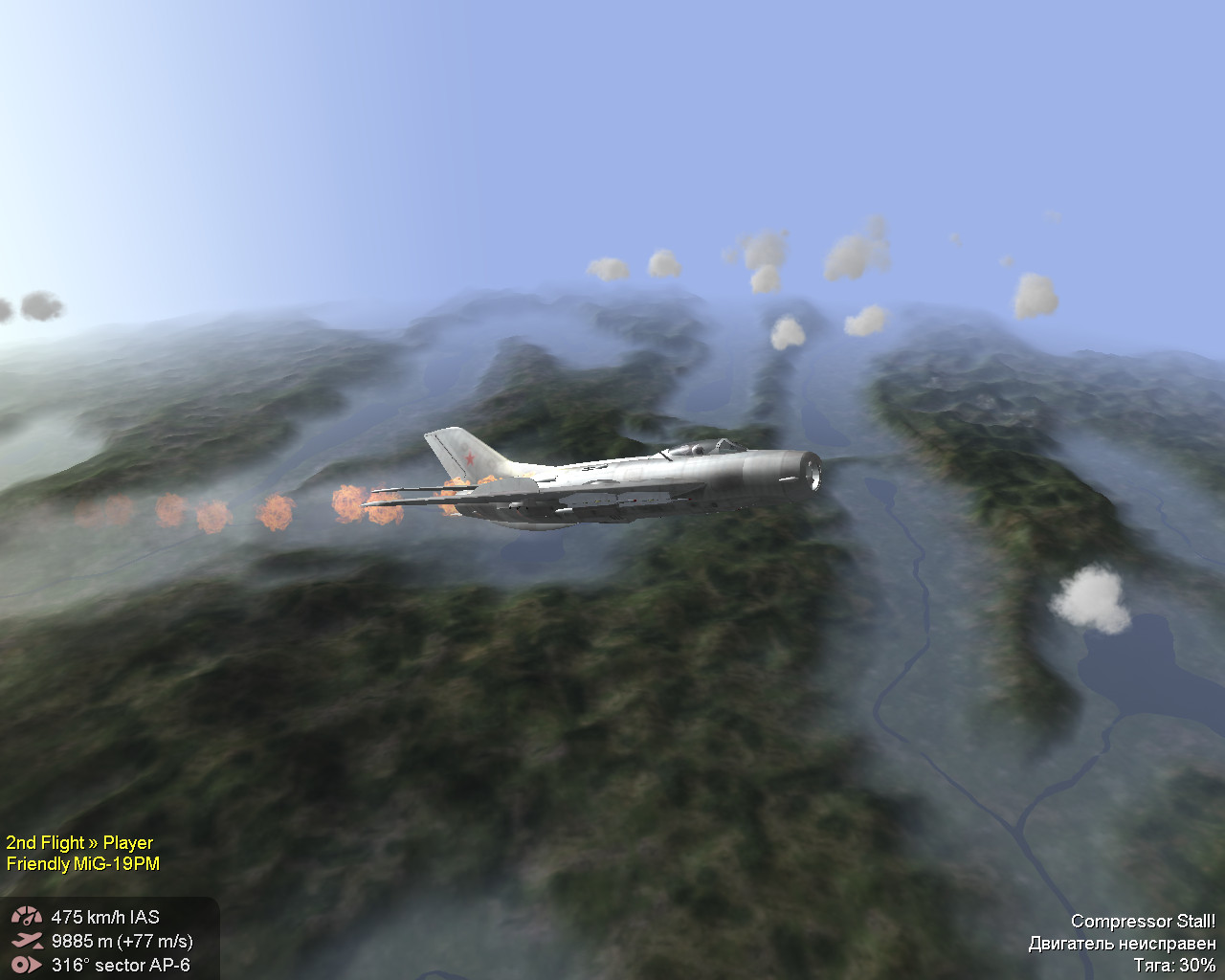 Валерий, наглость натовцев меня задела. Попробовал перехват на МиГ-19ПМ, с 4 К-5М и ПТБ. Драматизм при перехвате реально зашкалил. РЛС вывела меня на цель, правда с ходу я ее проскочил, уже за Рыбачьим развернулся, на сверхзвуке догнал, сбросив ПТБ, и пользуясь уже показаниями РП-5. Лчень мешает солнце, слепит. Предупредительного огня открыть не мог, поскольку 19ПМ пушек не имел, на мое маневрирование "Вулкану", естественно, пофиг. Оттянулся назад, ГСН вроде по звуку захватывают цель, первые два пуска - УР разрываются до цели, не могут догнать, похоже. Подхожу ближе - ракеты уходят мимо. робую тараном снести ему хвост - три попытки - и все мимо, аккуратно не выходит. И тут хлопок в двигателе! Отказ. Начинаю пробовать запуск: двигатель неисправен. Следующие сюрприз - отказ второго. Как это все смоделировалось - не представляю. Противник уходит, а я с высоты 14 км удачно выхожу без двигателей на свой аэродром. Все замечательно - но переборщил с воздушным тормозом, при попытке скинуть скорость не дотянул до ВПП - взрыв.