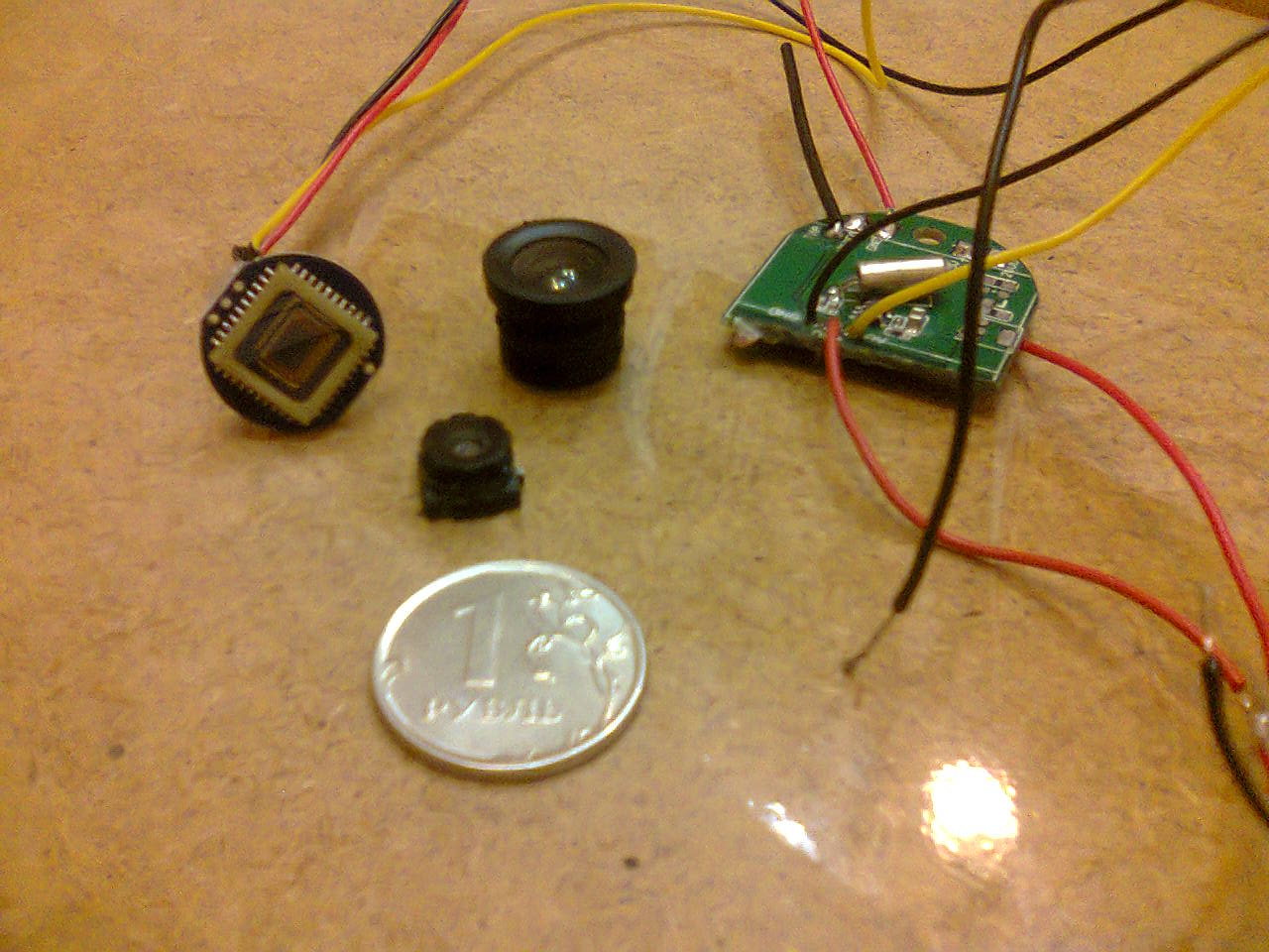 На фотках, старый и новый объектив с матрицей камеры, передатчик с обломанной платой, питание.