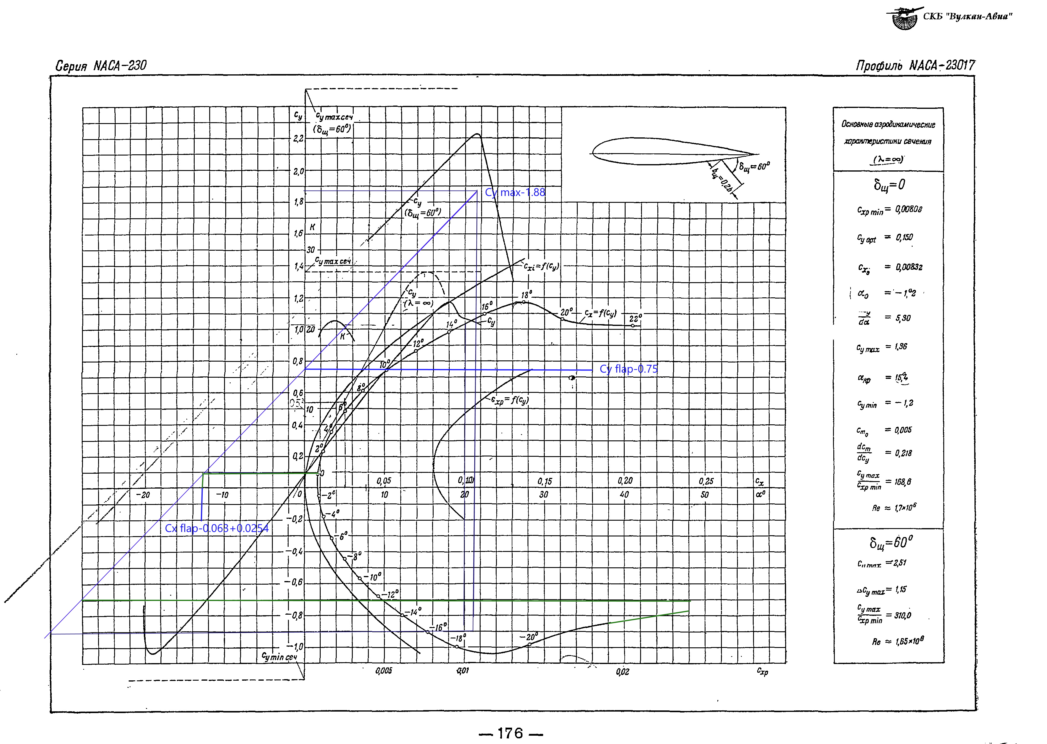 [Polares] lineCyCoeff 0.08933267 // 0.6205:7*=0.8864285 для 14% и 0.92714 для профиля 17% AOAMinCx_Shift 0.532 Cy0_0 0.16 AOACritH_0 18.0 AOACritL_0 -16.0 CyCritH_0 1.2860934 CyCritL_0 -0.884 CxMin_0 0.0342 parabCxCoeff_0 4.2E-4 Cy0_1 0.54128325 AOACritH_1 16.8 AOACritL_1 -20.0 CyCritH_1 1.371284 CyCritL_1 -0.60 CxMin_1 0.09977 parabCxCoeff_1 4.5E-4 parabAngle 4.0 Decline 0.008 maxDistAng 30.0 draw_graphs 0 Поэтому просто наложил линию Су от Сасовской поляры на график. Завтра попробую прикрепить картинку., сейчас интернет лежит и картинка на сайт не проходит., ![]() Сх чуть меньше - это для Тип-10. Для Тип-18 будет оригинал 0.035. Осмысление соотношения данных профиля Кларк YH-14/17 и поляры из САСовской фм для И-16 продолжается. Нужно так выставить критические углы, что бы в поведении Ишака проявились его реальные особенности. Для "работы" над Ишаком очень не хватает ![]() времени. Работа и домашние обязанности занимают большую времени суток. Последний раз редактировалось Vasya; 07.10.2021 в 09:08. |
