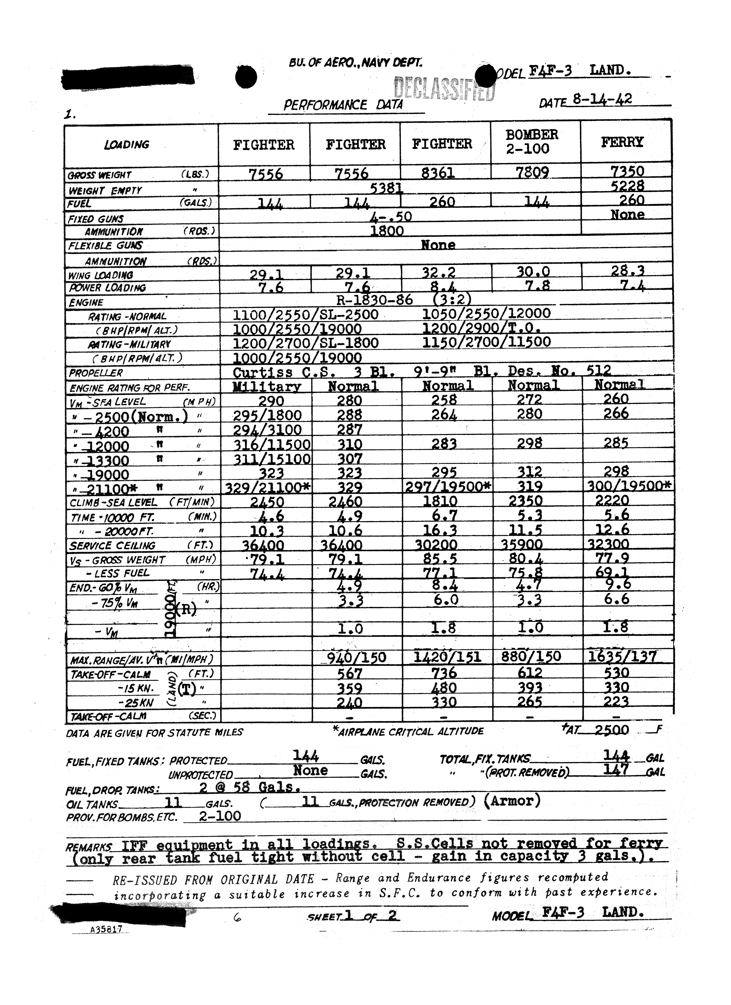 [R-1830-86/Twin-Wasp/DF/F4F-4] Type Radial Autonomous 1 Cylinders 14 Extinguishers 4 Carburetor 1 Direction Right HorsePowers 1100.0 BoostFactor 1.0 WEPBoostFactor 1.091 cAfterburner 0 AfterburnerType 10 cMix 1 MixerType 2 MixerAltitude 2000.0 cProp 1 PropMass 150.0 RPMMin 200 RPMNom 2550.0 RPMMax 2550.0 RPMMaxAllowed 3060.0 Reductor 0.6667 PropDiameter 3.0 PropAnglerType 2 PropAnglerSpeed 0.090 PropAnglerMinParam 1700.085 PropAnglerMaxParam 2550.0 PropAnglerAfterburnerParam 2700.0 PropPhiMin 23.0 PropPhiMax 53.0 PropAoA0 11.0 Voptimal 330.0 cCompressor 1 CompressorType 1 CompressorSteps 3 CompressorPAt0 0.5 CompressorRPMCurvature 7.0 CompressorPMax 1.62 // 47Hg CompressorAltitude0 1050.0 // 3450ft CompressorMultiplier0 1.0 // 3450ft 45Hg - 1200Hp CompressorBaseMultiplier0 1.0 // 3450ft 43Hg - 1100Hp CompressorAltitude1 3810.0 // 12500ft CompressorMultiplier1 0.958333 CompressorBaseMultiplier1 0.95455 // 12500ft 43Hg - 1050Hp CompressorAltitude2 5944.0 // 19500ft 43Hg CompressorMultiplier2 0.875 // 21000ft 43Hg - 1000Hp CompressorBaseMultiplier2 0.909 // 19500ft 43Hg - 1000Hp CompressorRPMP0 700.0 CompressorRPMPMax 2700.0 CompressorMaxATARPM 1.48 // 43Hg CompressorSpeedManifold 0.65 CompressorRPM0 450 CompressorATA0 0.40 CompressorRPM1 1000 CompressorATA1 0.60 CompressorRPM2 1200 CompressorATA2 0.65 CompressorRPM3 1600 CompressorATA3 0.90 CompressorRPM4 1800 CompressorATA4 1.00 CompressorRPM5 2000 CompressorATA5 1.10 CompressorRPM6 2200 CompressorATA6 1.20 CompressorRPM7 2400 CompressorATA7 1.30 CompressorRPM8 2550 CompressorATA8 1.48 DisP0x 2550 DisP0y 0 DisP1x 0 DisP1y 50 cRadiator 1 TESPEED 0.021 TWATERMAXRPM 186 TOILINMAXRPM 70 TOILOUTMAXRPM 90 MAXRPMTIME 600 MINRPMTIME 999 TWATERMAX 232 TWATERMIN 130 TOILMAX 120 TOILMIN 40 FuelConsumptionP0 = 0.235f FuelConsumptionP05 = 0.205f FuelConsumptionP1 = 0.250f FuelConsumptionPMAX = 0.285f не предусмотрена, то до 3500футов/1000 метров будет первая скорость нагнетателя, до 3800 метров вторая скорость, а до 5944 метра "третья скорость" - в кокпите есть ручка для переключения скоростей - она двигается. По наддуву тоже некоторый компромисс - в реале он колеблется +- 0.5-1Hg в зависимости от положения скорости нагнетателя. Наддув переводил в техническую атмосферу вот этой программой: https://www.translatorscafe.com/unit...rcury%20(0°C)/ Высотность вот этой: https://www.unitjuggler.com/перевод-....html?val=3500 Мощность на второй ступени так же будет корректироваться. У ранних Видлкетов винт имел "насадки интересной формы", У поздних уже был более "стандартный" винт. Возможно из-за несовершенного винта на средних и больших высотах немного падала эффективность и снимаемая мощность была меньше, чем у земли. (Поэтому мощность будет "подганяться" под требуемую скорость по документам испытаний.) ----------------------------------- Коррекция мощности после расчётов не понадобилась. Ф4Ф3 на высоте 22000 футов показал в среднем 530 км. в час. Ф4Ф4 на высоте 6000 метров показал около 517 км. в час. ---------------------- И всё таки лучше сделать исторично - виртуальных ступеней нагнетателя будет 3. --------------------------- Читаю: https://warspot.ru/4797-tsveta-voenn...redizemnomorie https://war-book.ru/f4f-wildcat-istr...firmy-grumman/ https://ru.wikipedia.org/wiki/Grumman_F4F_Wildcat https://www.warbirdforum.com/cyclone.htm Последний раз редактировалось Vasya; 17.09.2022 в 03:42. Причина: дописка текста |