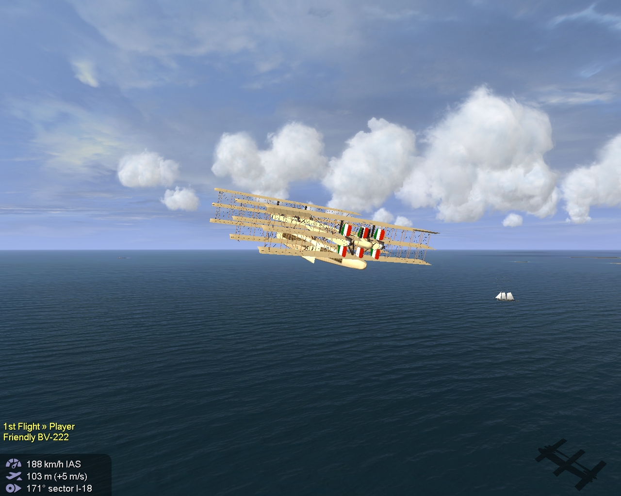 Подробно о ней здесь: https://fonzeppelin.livejournal.com/52508.html Не помню, были ли миссии с ней. Но интересно посмотреть, и вот небольшая миссия для нее. Очень интересно соделировано, точно и красиво. Миссия:вылет на фиксацию испытаний Период: 1939 год Сторона: Италия Место действия: полигон близ о.Стромболи Карта: Италия сетевая Задание: сопровождение бомбардировщиков Кант Архив закинуть в папку отдельных миссий, появится папка "Италия", в ней в папке SM-79 миссия. Доступный самолет: SM-79 Версия: 4.15, или ранее, в БАТ мотобомба не пошла, вылет игры. |