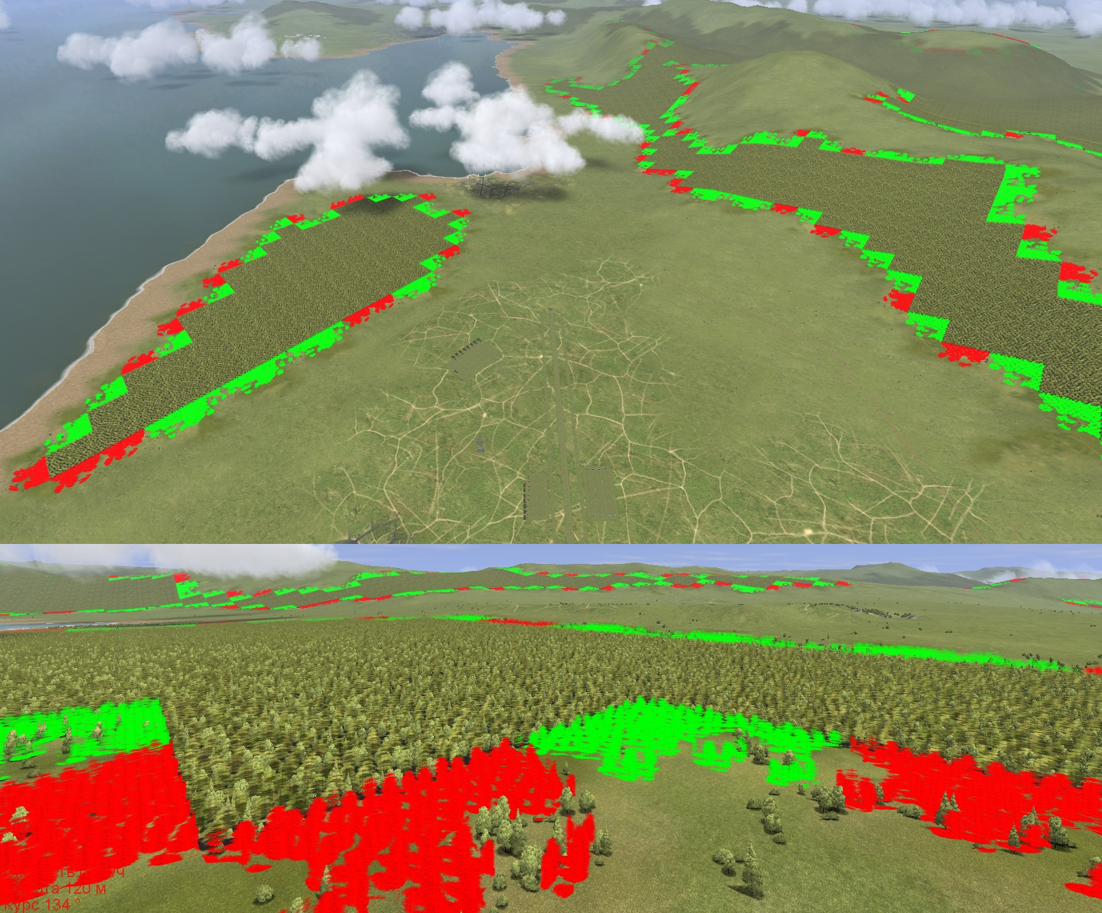 Там особо усложнений нет, режим создан лёгкой модификацией стандартного режима Forest=3 Глубокий лес, т.е. зоны леса не являющиеся опушками, засеваются шейдерными деревьями. При сравнении лесов на Кубани и Словакии, в целом всё одинаково по исполнению. Ну может на Словакии чуть больше небольших лесочков, состоящих по большей части из опушек. На картинках можно поглядеть, красные и зелёные это опушки. Внутри них зона с глубоким лесом которая засевается деревьями. Т.е. у этих зон засева чёткие прямоугольные границы. И сделать плавный и малозаметный переход можно только 1)цветом основного леса и цветом шейдерных деревьев. эти цвета должны совпадать. Это основной пункт который сможет обеспечить для режима Forest=4 более-менее красивую картинку. Т.е. карты где некрасиво надо дорабатывать. И стараться, чтобы смотрелось как на дефолтной Кубани. 2)снижением дистанции отрисовки шейдерных деревьев. т.е. если Forest3Distance=0 то это менее заметно, а если прописать Forest3Distance=9 то станет граница заметнее. Последний раз редактировалось yt2; 13.04.2023 в 19:54. |