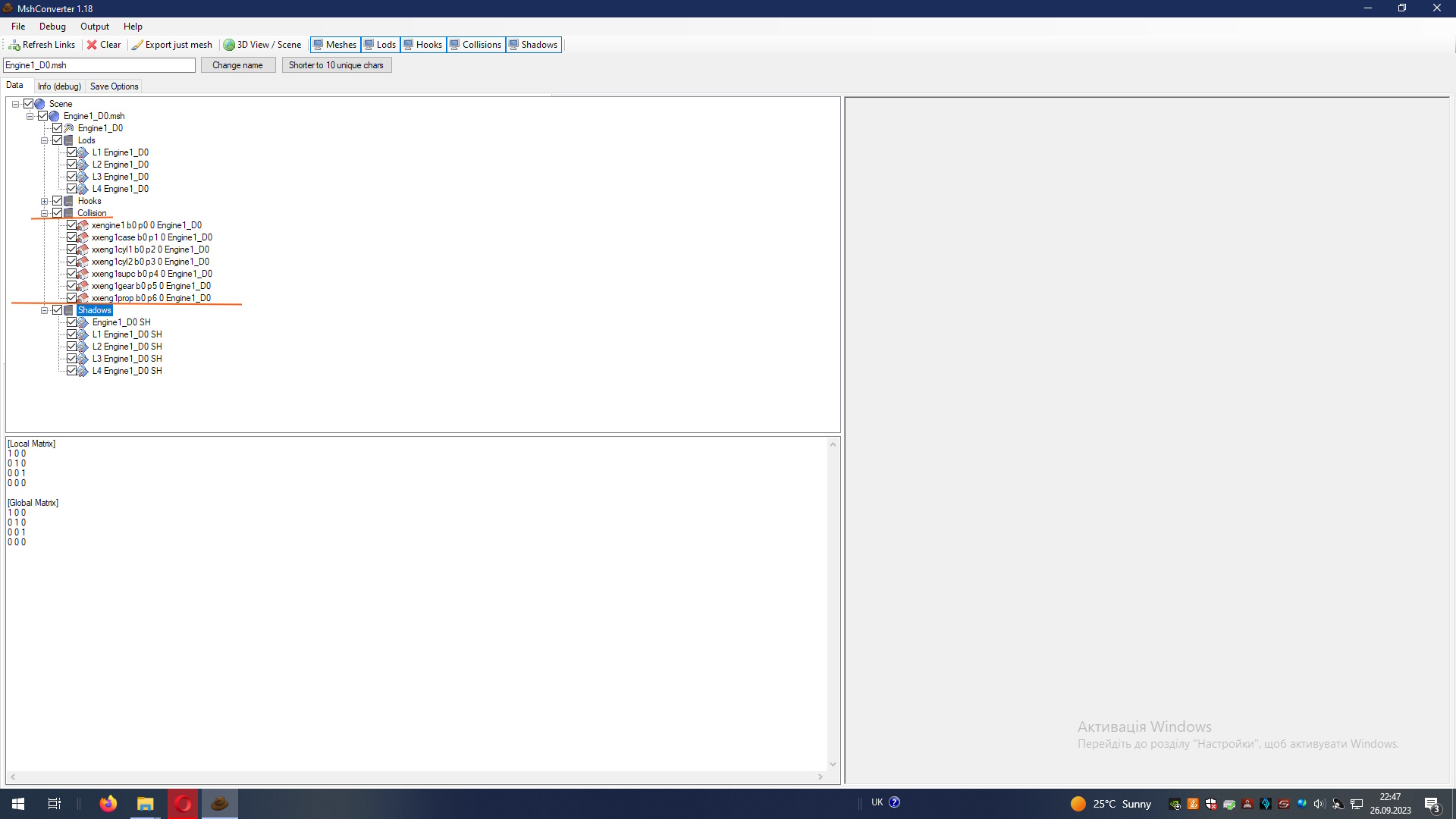 В начале я начал править коллизии через Notepad и смотреть результаты с помощью программы от NB79. Потом всё равно потребовался 3Д Макс. Сейчас коллизии делаю в Максе, потом экспортирую в Иловский формат, в текстовом редакторе копирую секцию с коллизиями из нового меша в оригинальный. На МиГах я добавил оверлеи через блокнот. 3Д Макс всё равно потребовался. Вначале я на родных мешах скопировал полигоны, чуть отодвинул от фюзеляжа и перенёс на рандомный материал (не разобрался с редактором материалов, мне показывали как делать оверлеи, но у меня или версия не та или ещё что не так до этого сделал). Затем этот меш экспортировал в Иловский формат, через Notepad вписал правильное имя материала и импортировал в Макс. Макс уже подхватил правильную текстуру для оверлея и осталось только правильно разместить текстуру оверлея на полигонах. Затем экспортировал в Иловский формат и оттуда скопировал нужные строчки в родные меши. Затем пересохранил меши программой от NB79 со включённой функцией коррекции оверлеев. При наличии исходника модели всё можно было бы сделать гораздо быстрее и без танцев с бубном.