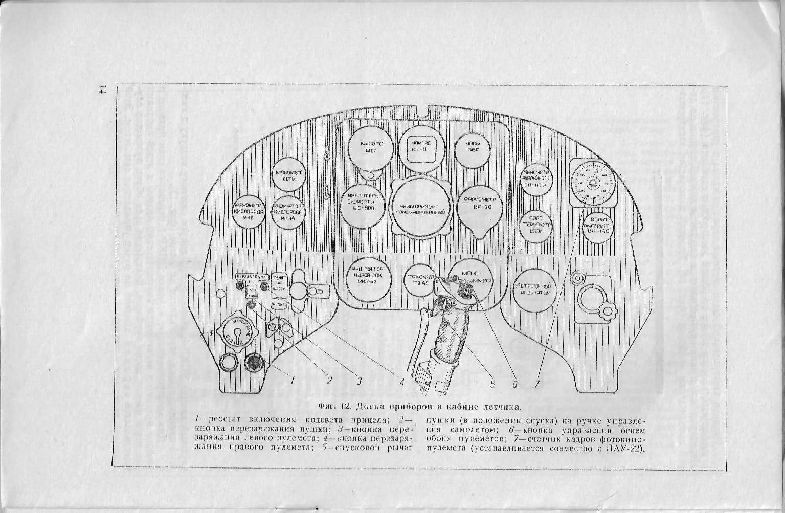 Бензиномеры установлены на бензобаках. Указатели, бензиномеров видны из кабины через окна в обшивке крыла, закрытые плексигласом. На приборной доске установлены следующие приборы: 1 Высотомер на 12 000м 2 Компас КИ-11 3 Указатель скорости УС-800 4 Указатель поворота УП-1 5 Вариометр ВР-30 6 Часы АВР 7 Мановакуумметр До 160 см рт. ст. 8 Тахометр электрический ТЭ-22 9 Трехстрелочный моторный индикатор 10 Аэротермометр воды Жидкостный 11 Манометр пневмосистемы 12 Вольтамперметр ВА-140 Как видно, бензиномеры только в консолях. Иного способа контроля за расходованием топлива, как открыть фонарь и посмотреть на бензиномер, не предусмотрено. |