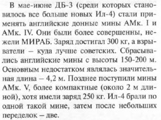 https://drive.google.com/file/d/1Zvj...ew?usp=sharing Ну вот процитирую. "2 октября (1944 г.) четыре Ил-4 вылетели для минной постановки в Ирбенский пролив. Три самолета выставили девять мин в проливе четвертый вернулся попав в сложные метеоусловия. Второе и последнее минирование в этом месяце имело место в ночь на 7 октября. Ил-4 капитана Клименко в первом вылете выставил 3 А-5 у Либавы, но во втором был перехвачен фокке-вульфами мины сбросил над сушей, но уйти не сумел, был сбит... ...В ноябре на постановки у Либавы выполнили 8 вылетов. Два бостона попали в СМУ и задачу не выполнили в то время как шесть одиночных вылетов одного Ил-4 (4, 13, 17, 22, 23, 26 ноября) имели своим результатом 13 выставленных А-5." Кстати бостоны СФ в 1944 иногда летали на торпедные атаки с двумя Мк-XII из запаса что доставили для хэмпденов. |