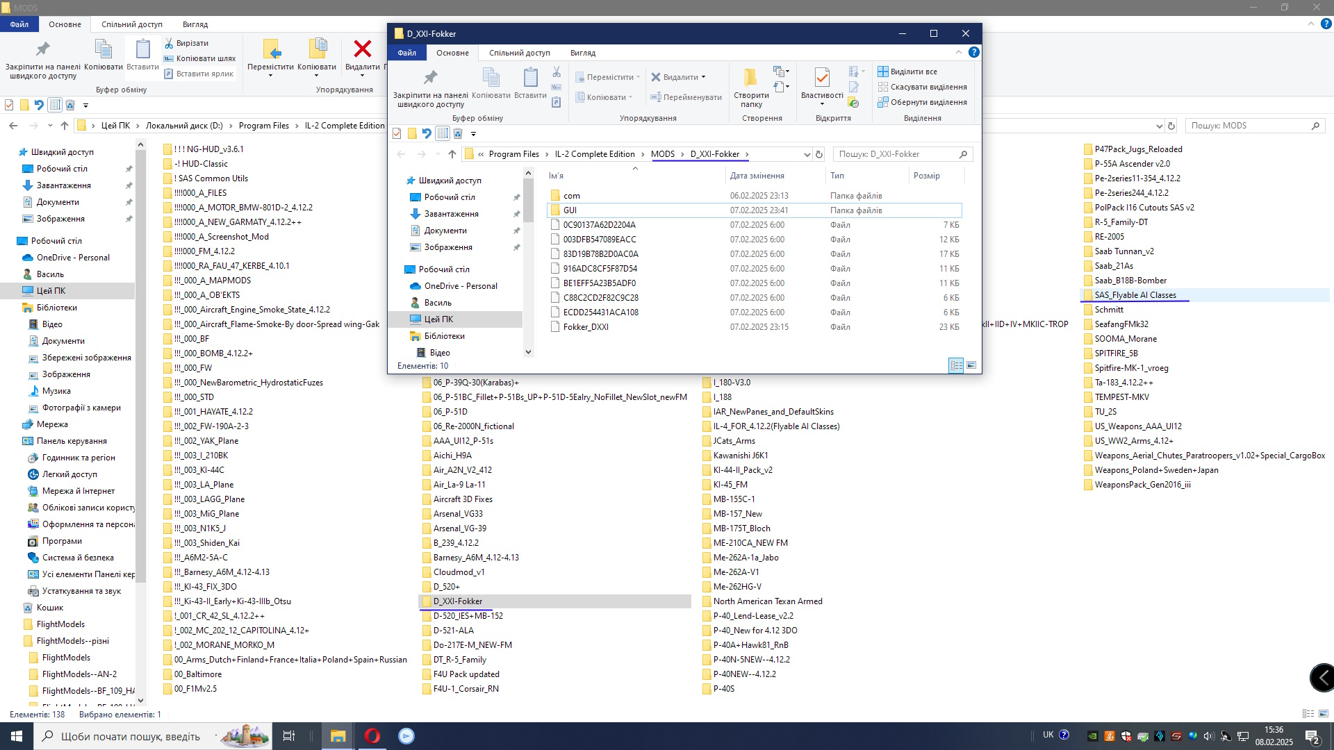 Просто к дефолтным Фоккерам прикручивается новая фм. ....................... А сами хеши/классы Фоккеров можно положить в любую удобную вам папку с модами. В БАТ скорее всего достаточно совместить папку аир, в которой классы, с такой же в БАТ, а файлик с фм положить в батовскую папку со всеми фм. Я сейчас буду ехать на работу, после обеда смогу сделать скрины папок МОДС И САС - что и где у меня расположено. --------------------- В пачте 4.12.2 с папкой МОДС расположил папочку D_XXI-Fokker с модоам так: ниже картинка. Лучше конечно в Модакте 5-30 все хеши и файлик с фмд/емд Fokker_DXXI закинуть в папку SAS_Flyable AI Classes - на замену классов согласится.