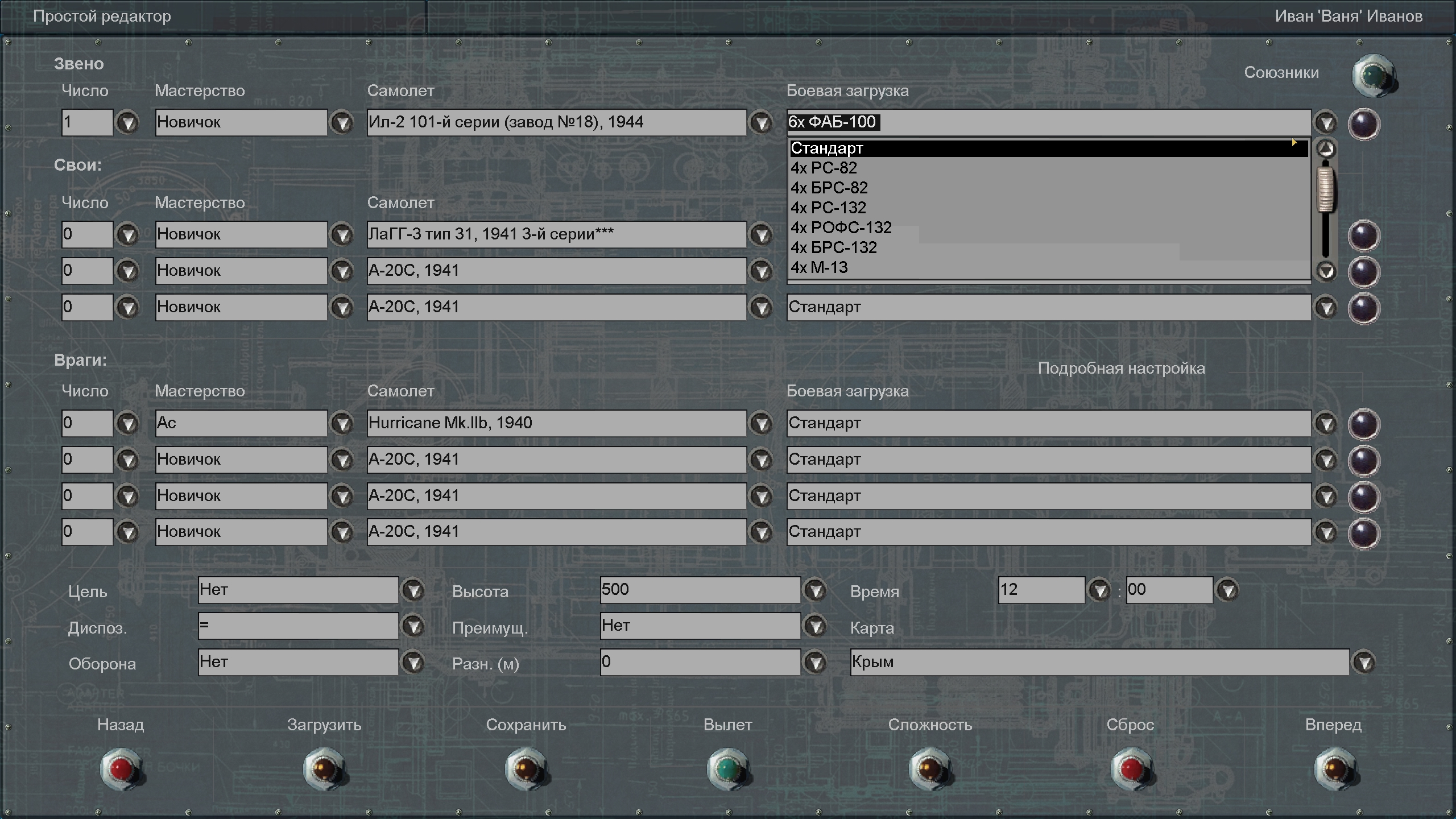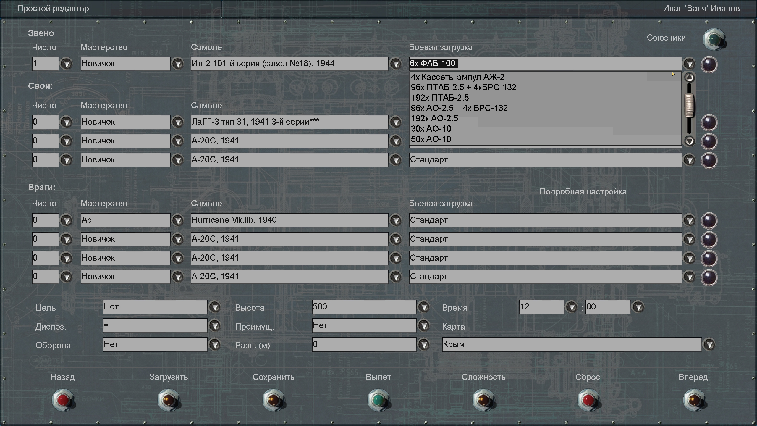 Il-2_3.30xAO10 30x AO-10 Il-2_3.50xAO10 50x AO-10 Il-2_3.4xFAB50 4x FAB-50 Il-2_3.4xFAB50_4xRS82 4x FAB-50 + 4x RS-82 Il-2_3.4xFAB50_4xRS132 4x FAB-50 + 4x RS-132 Il-2_3.4xFAB50_4xROFS132 4x FAB-50 + 4x ROFS-132 Il-2_3.6xFAB50 6x FAB-50 Il-2_3.2fab100 2x FAB-100 Il-2_3.2fab1004b8 2x FAB-100 + 4x BRS-82 Il-2_3.2fab1004b3 2x FAB-100 + 4x BRS-132 Il-2_3.4xFAB100 4x FAB-100 Il-2_3.6xFAB100 6x FAB-100 Il-2_3.2xFAB250 2x FAB-250 Il-2_3.2xVAP250 2x VAP-250 Il-2_3.2xRRAB3 2x RRAB-3 Il-2_3.96xAO254b3 96x AO-2.5 + 4x BRS-132 Il-2_3.192xAO25 192x AO-2.5 Il-2_3.none Empty |