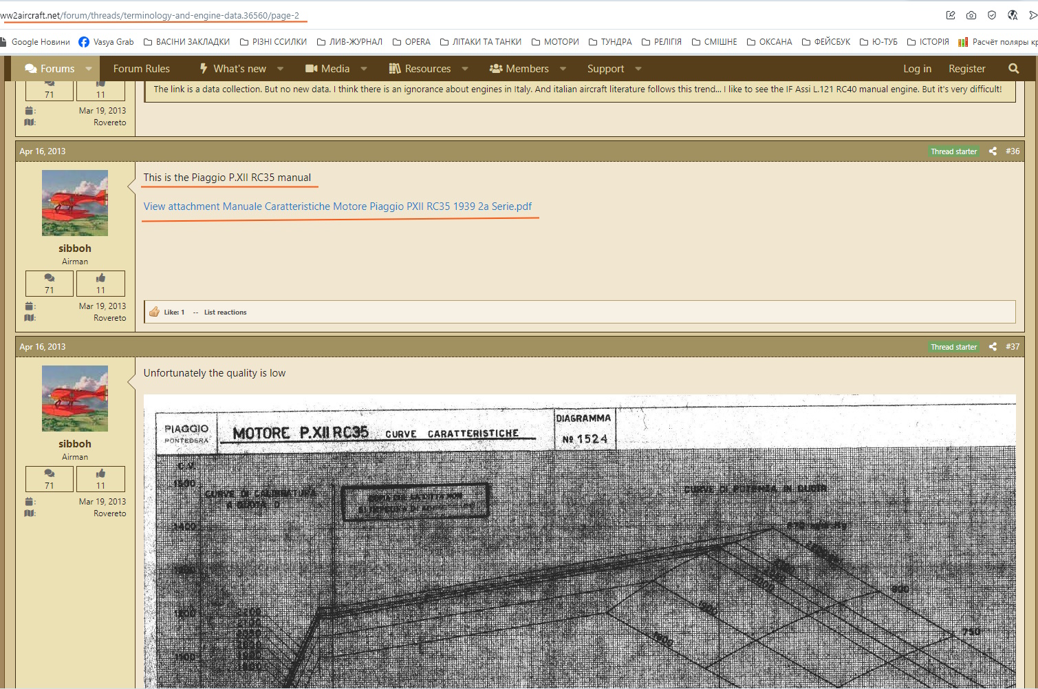 У нас в Иле мощность считается от редуктора. Но я умудрился высчитаывать снимаемую мощность приблизительно +- 15 коняк. ------------------------ По нашему Пьяджо. Обороты 2200 на графике мощности есть, но добавляют только 20 коняк. Номинал 2050 об. 870 наддува. Я уверен, что мощность в 1500 л.с. на взлёте чистой воды пропаганда/пиздёж. Без повышения наддува и оборотов несчего снять. Его братец 45 модель, который 14 цилиндров выдавал 1160 коней при 2400 оборотах и 940 мм. наддува. При наддуве 880 мм. мощность была 1000 коняк. То есть полностью открытый дроссель добавлял 160 коней, но обороты нужны были аж 2400. Полагаю, что обсуждаемый нами 35 мотор, который 18 цилиндров, заглотить наддува выше 930 не мог в принципе. И мощности выше 1300 сил у земли иметь не мог без 2 ступеней нагнетателя. Если прочертить линию форсажной мощности от 1300 л.с. вдоль номинальной мощности, то как раз на высоте 4000 метров получиться проспектная мощность в 1500 коней. Причиной плохой форсированости мотора могут быть каналы головок, которые достались от Гном-Рона, он же М-88, который выше 1000 сил плохо поддавался форсировке и только при оборотах 2370. Конструкция мотора Запорожца подобная и форсировке неподдающаяся. На заводе Альфа-Ромео, который тоже выпускал Пьяджо-35 в моторе ломало коленвалы, возможно поэтому более высокие обороты мотора были недопустимы из-за хлипкости конструкции. ----------------- Глаза слипаются, утром почитаю и отвечу.