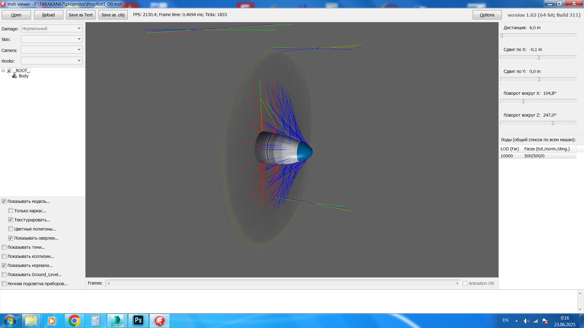 Здравствуйте. Опять у меня проблема. Некорректно отображается обтекатель втулки вращающегося винта. Причём проявляется по разному в зависимости от угла освещения в игре.