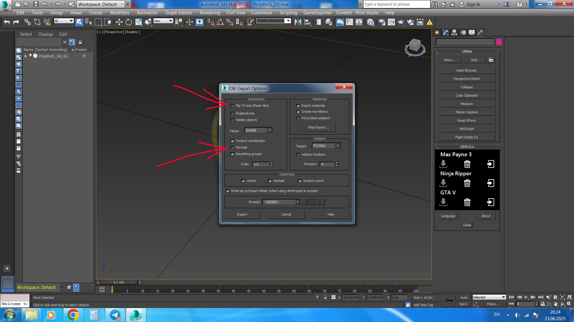 2. если по п. 1 все верно, то экспортируйте меш из макса в простое OBJ в ту же папку где и текстуры, обратив внимание где надо убрать галочки(см картинку OBJ). Этим экспортом в OBJ без нормалей вы как-бы "обнулите нормали". Затем опять в макс импортируйте этот меш из созданного OBJ, пройдите все процедуры спаивания точек, назначения автослаживания, проверки и исправления названий, проверки правильного назначения текстур и материалов. Снова экспортируйте в формат игры ИЛ-2. Проверьте в просмотрщике нормали. Если и после этого нормали остануться кривые, то переустанавливайте 3 Д макс 2016, желательно из другого источника. Скорее всего эта версия 3д макс 2016 "кривая", так бывает....