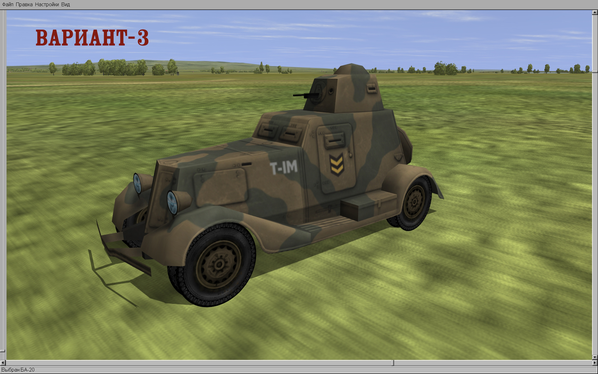 В архиве три варианта, которые показаны на скриншотах. В архиве выбрать папку варианта, из неё взять папку "ВА_20" и положить её по адресу: MODS/Files/3DO/Cars Жаль, что в игре нет возможности "одевать" объекты в индивидуальные скины, как можно с самолётами.) |