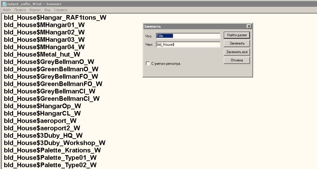 Отсюда разброд и шатания при необходимости картоделу в файле InBuildings одномоментно и без затрат времени на эту рутину ввести в каждую строку нужный постфикс. Собсно, как по мне, всем мододелам следовало бы придерживаться в наименованиях одного стандарта, и все было бы гармонично и просто. Но увы. Поэтому заказал Google Gemini два батника.