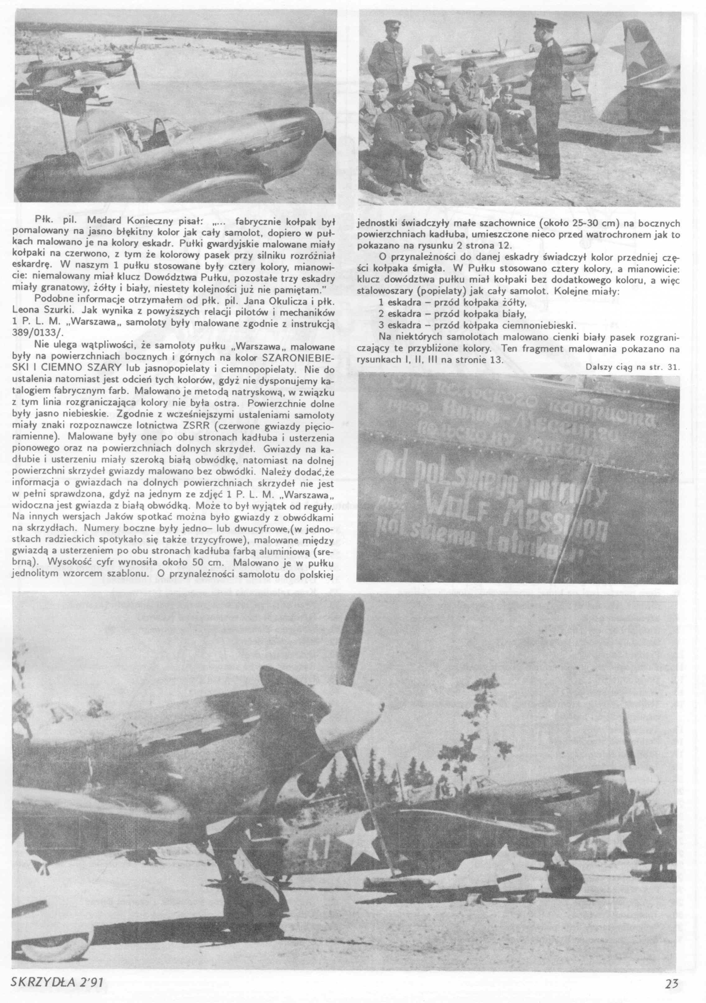 Собственно, вот и разъяснение про разный вид надписи: "Иногда дарственная надпись даже пе*реносилась с одного самолета на другой, как это было в 1-м польском иап "Варшава". В период обучения М.Конечный полу*чил Як-1 с бортовым номером 48 и надпи*сью на русском и польском языках: "От польского патриота проф. Вольф-Мессинга — польскому летчику", выполненной серебрянкой. После завершения подго*товки к боевым действиям надпись пе*ренесли, правда, только на русском язы*ке, на специально отобранный, новый, из поступивших с завода, Як-1 с бортовым номером 13. На старом надпись закрасили. Какое-то время Конечный летал на обоих самолетах, но вскоре передал новый "именной" самолет Е.Чжовинскому, пока*завшему лучшие результаты при обучении."