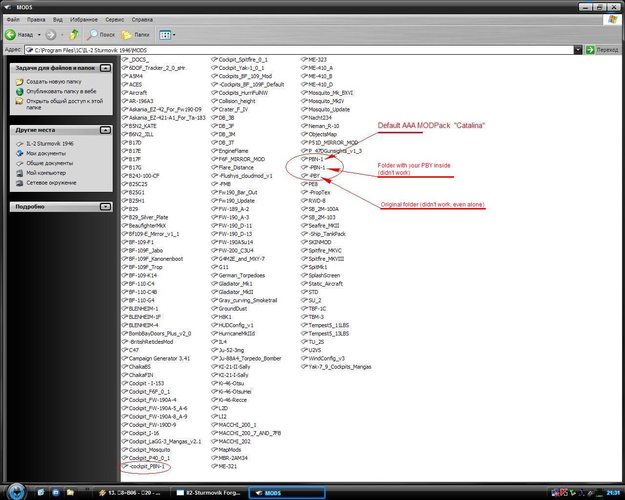 "Каталинскую" папку я открыл, однако насладиться глубинными бомбёжками так и не смог. Проблема: В моём "Иле" установлен стандартный ААА модпак. Там папка Каталины значится как PBN-1. Плюс кокпит (тоже аркадный). Всё работало нормально. В ридми к предлагаемой версии написано, что папку PBY нужно просто поместить в папку MODS. Поместил. Каталина исчезла из списка предлагаемых крафтов в простом редакторе. В запускаемых одиночных миссиях Каталина идёт со стандартным лоадаутом (без гл. бомб и т.п.) Пытался отключить (-) папки PBN-1 и cockpit_ PBN-1, оставив только PBY – результат отрицательный. Пытался в папку PBN-1 (предварительно стерев оригинальное содержимое), вставить "внутренности" папки PBY – результат отрицательный. Сейчас вернул всё на место, отключив папку PBY. Жду ваших советов… |