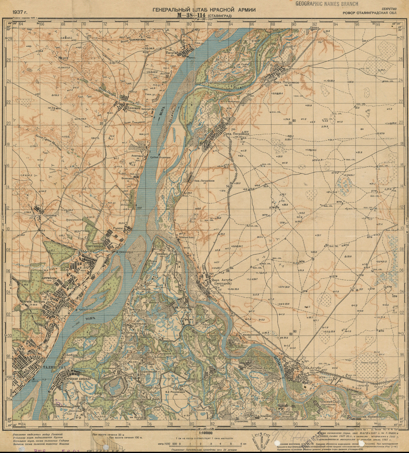 Но вот что я нашёл только вчера: карта 1937 года, до постройки Волжской ГЭС(50-е года). Как видно на карте вверх по течению в те времена Волга была уже (сечас там "Волжское море" водохранилище). А в пойме(месте, куда весной заливается вода) было очень много ериков, которые сейчас пересохли, из-за падения уровня воды. Одним словом чтобы привести в порядок эту карту надо хотябы: стереть город Волжский (который вырос после строительства ГЭС в 50-х годах) подправит карту рек и высот,урезать сам Сталинград. |