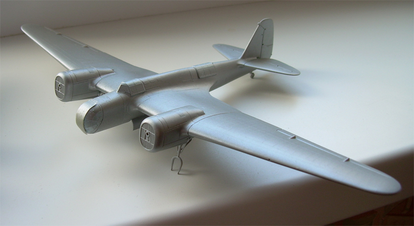 Разделительную полосу делал лентой тамиевской. Можно чем угодно и как угодно, хоть газетой намыленной. Это всё деки хорошо приваренные спиртом и сольвентом. А СБ-2 у меня уже загрунтован и залит серебрянкой (на фото). Заказчик подбирает сейчас на него козырный вариант на июнь 41-го, а они чаще с МВ-3 попадаются.