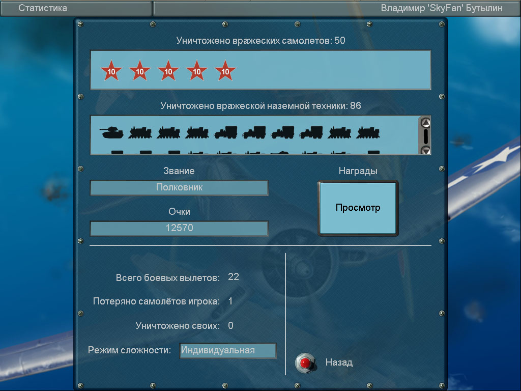 Видя по курсу звено "Ил-четыре" Синий вирпил рапортует в эфире: "Курс шестьдесят, три пятьсот высоты, Я атакую звено "Ил-четы..."" ...Ярко внизу полыхает костер - Не фиг с шести заходить на бомбер! ![]() А если серьезно, то в кампании в КАЖДОЙ девятке бомберов роли распределены следующим образом: - в ведущей тройке ас+ветеран+новичок, в ведомых -ветеран+новичок+курсант. Так что, все довольно гуманно. Главное, маневрировать и не подставляться. Тогда все будет ![]() Вот в качестве планки итог авторского контрольного предрелизного прохождения в обычной (не мини) версии (см. скриншоты). Треки всех боев имеются. С уважением