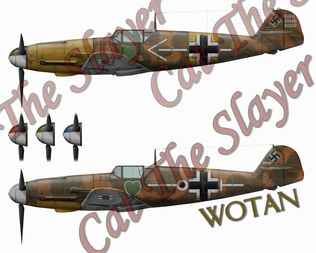http://aviaskins.com/downloadskin.aspx?id=1047&lang=en Машина, запечатлённая со всего левого борта на кинохронике при возвращении после 300-301 победы и фрагментами на нескольких фото. Кстати, на растиражированной по книгам фото, с подписью типа «Желтая-1 Хартманна, садится после 300-й победы», где трое мужичков на земле, возле вымпела 9-го штафеля, машут подлетающему к ним мессеру- фикция, ибо по кинохронике видно, что на машине Хартманна, кок окрашен в спираль, а не с треугольником напротив лопасти как на той фото. Или фикция кинохроника, где и лючок на носу откинут.
