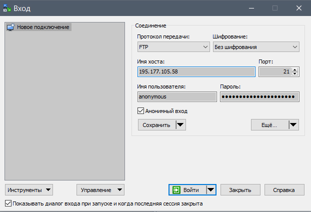 Всем, у кого возникли проблемы с Файлзиллой, можно воспользоваться аналогичным клиентом: https://winscp.net/eng/download.php Для скачки нужных файлов в настройках закладки "Новое соединение" выбираем "протокол передачи - FTP", вбиваем айпи 195.177.105.58 и ставим галку "анонимное соединение". Поля "имя пользователя" и "пароль" при этом заполнятся автоматически (скрин).