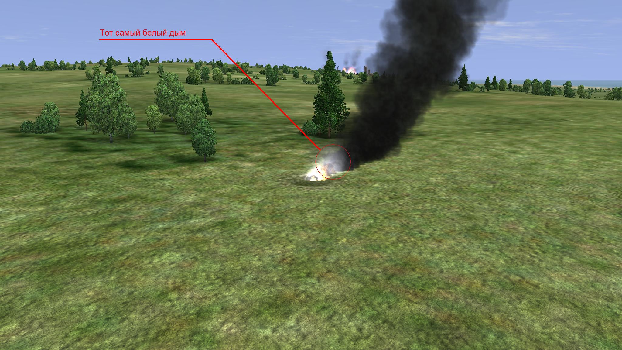 Этот дымок-это шлейф за горящим самолетом в полете, который продолжает генерится уже после падения самолета, вместе дымом горения на земле. Если его убрать, то придется убрать и сам шлейф (что сделал Холи Грейл). Но его эффекты были сделаны под Тихоокеаский твд. Наши же самолеты это фанера и перкаль. Поэтому от шлейфа Аед решил не отказываться, но в борьбе за фпс сделал время жизни ему минуту (примерно). Вообще, Аед из минимума возможностей (движка) постарался выжать максимум разнообрзаия для эффектов.