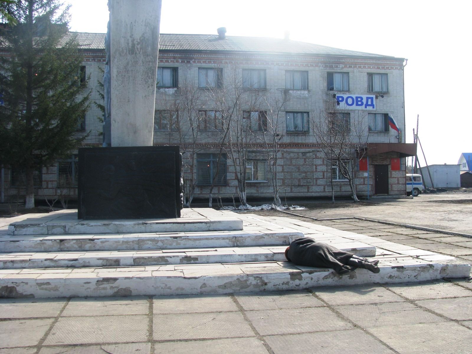 Предыстория - иду вчера по райцентру Тяжин, время 15-05, по аллее напротив райадминистрации мимо РОВД - милиции, по памятнику погибшим землякам. Вижу картину - и пенсионеры хором кричат: "Кто сфотографировал бы!" Уже прошел, но вспомнил, что у меня фотоаппарат в сумке - в суде с делом знакомился - и снял.. Снимал долго и упорно, в расчете, что менты узреют и среагируют.. похрену. |