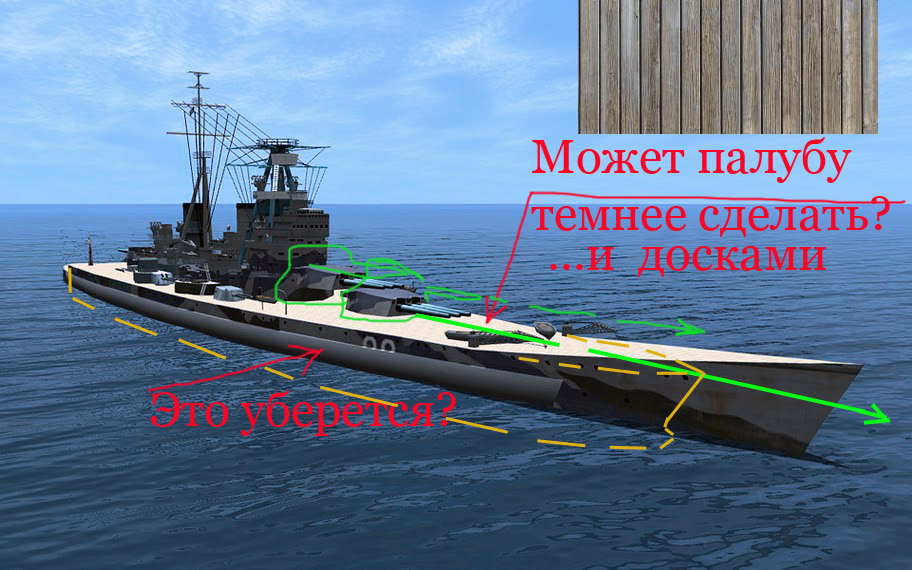 Может сразу чуть-чуть подправить саму форму корабля. Я имею в виду - малехо отпилить ему нос и корму на длину ствола орудия соответственно, и опустить высоту носа по горизонту.. Даже если приподнять передние башни- сектор горизонтального обстрела закрывается носом. И второе -палуба декорирована неестественно. Я конечно не моряк, но корабли видел... |